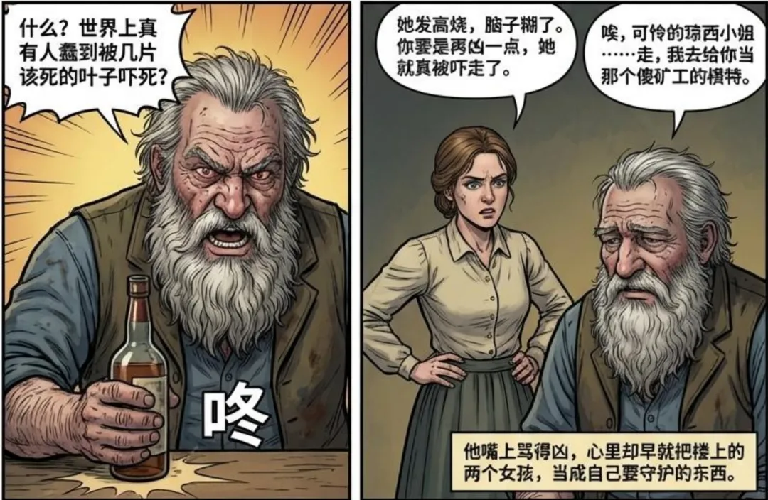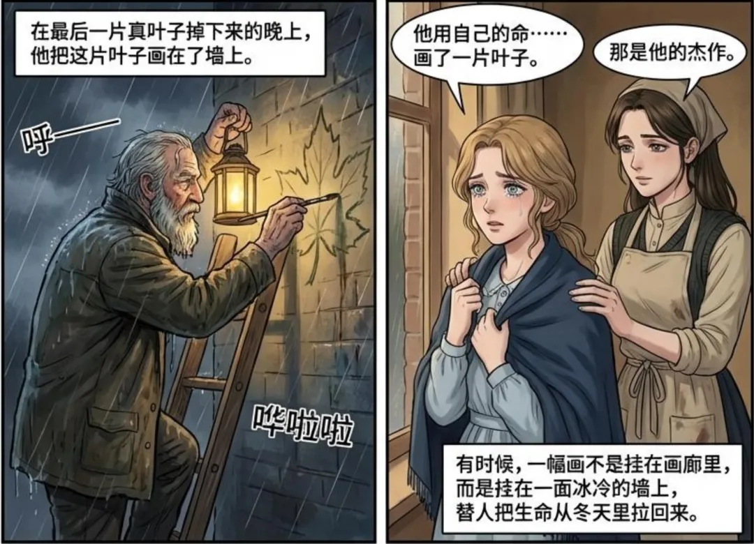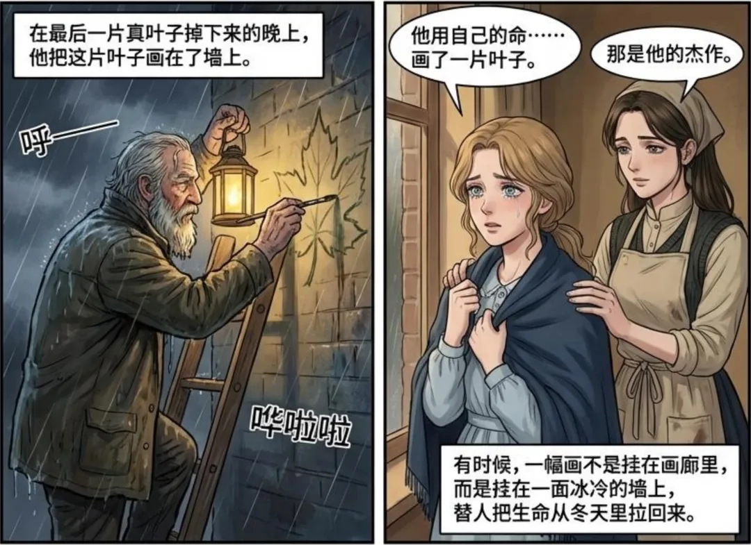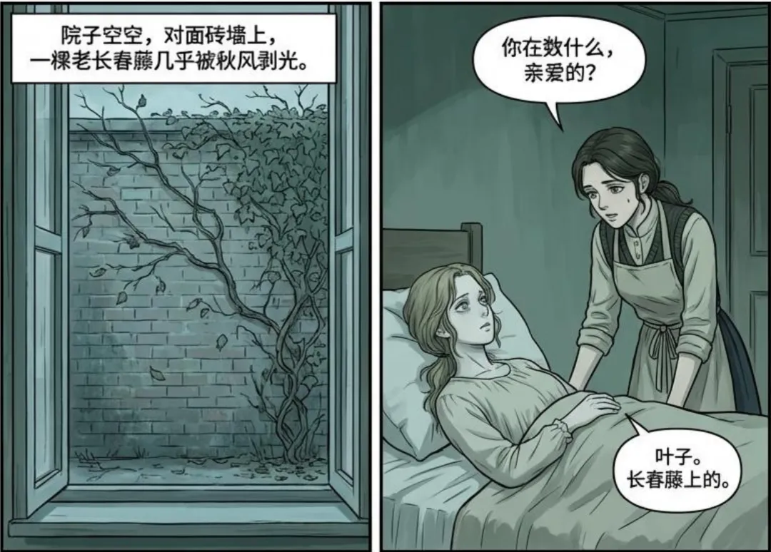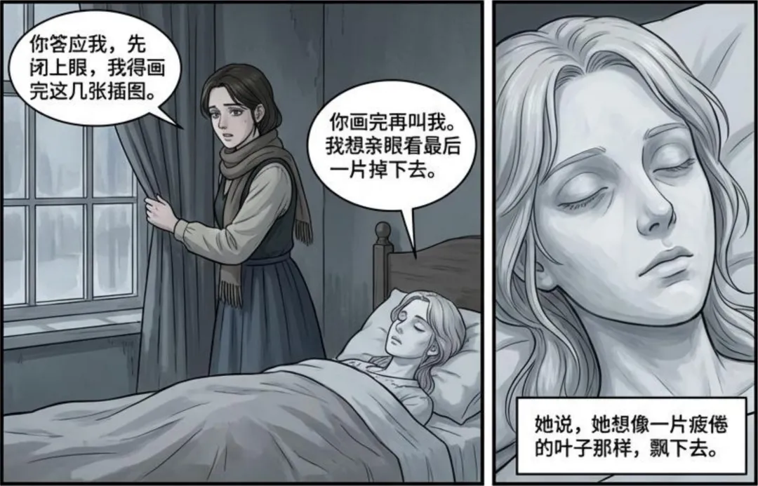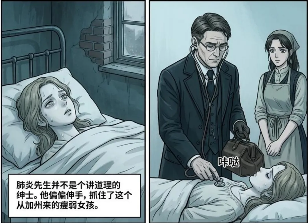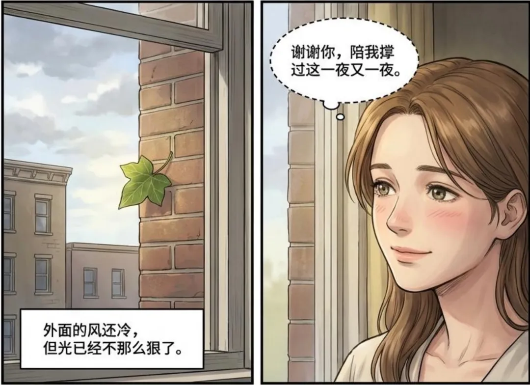 画面感极强 :老画家、病房女孩、窗外枯藤、阴冷雨夜、20世纪初纽约街区,自带天然漫画分镜感,可直观检验AI画面还原度;