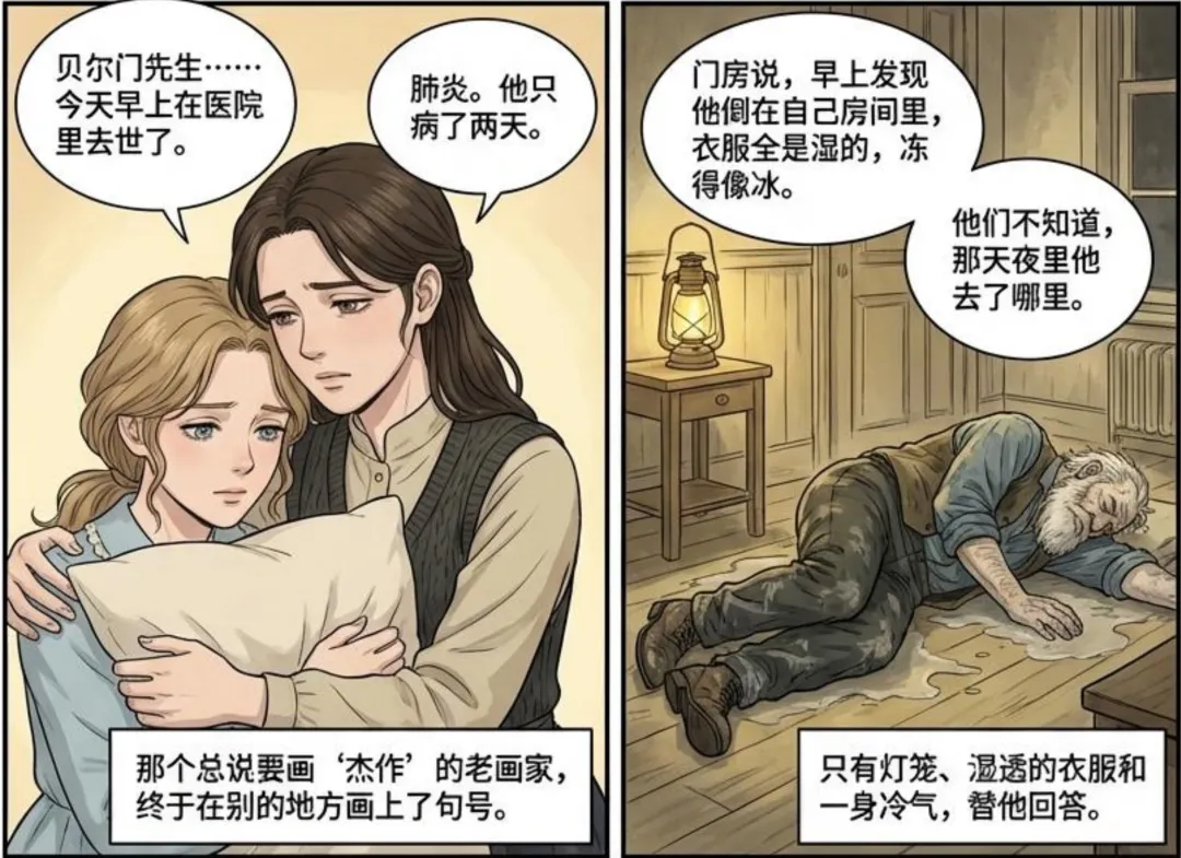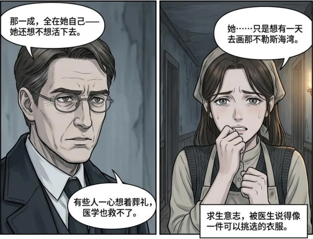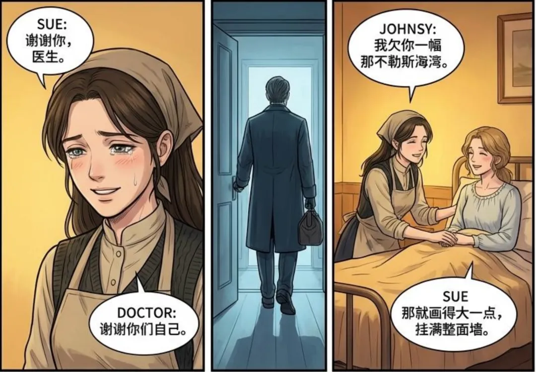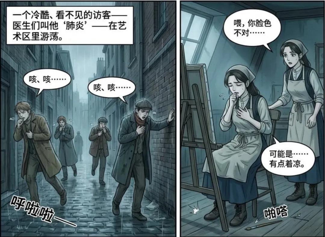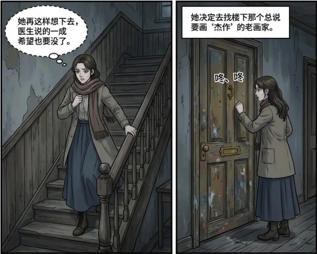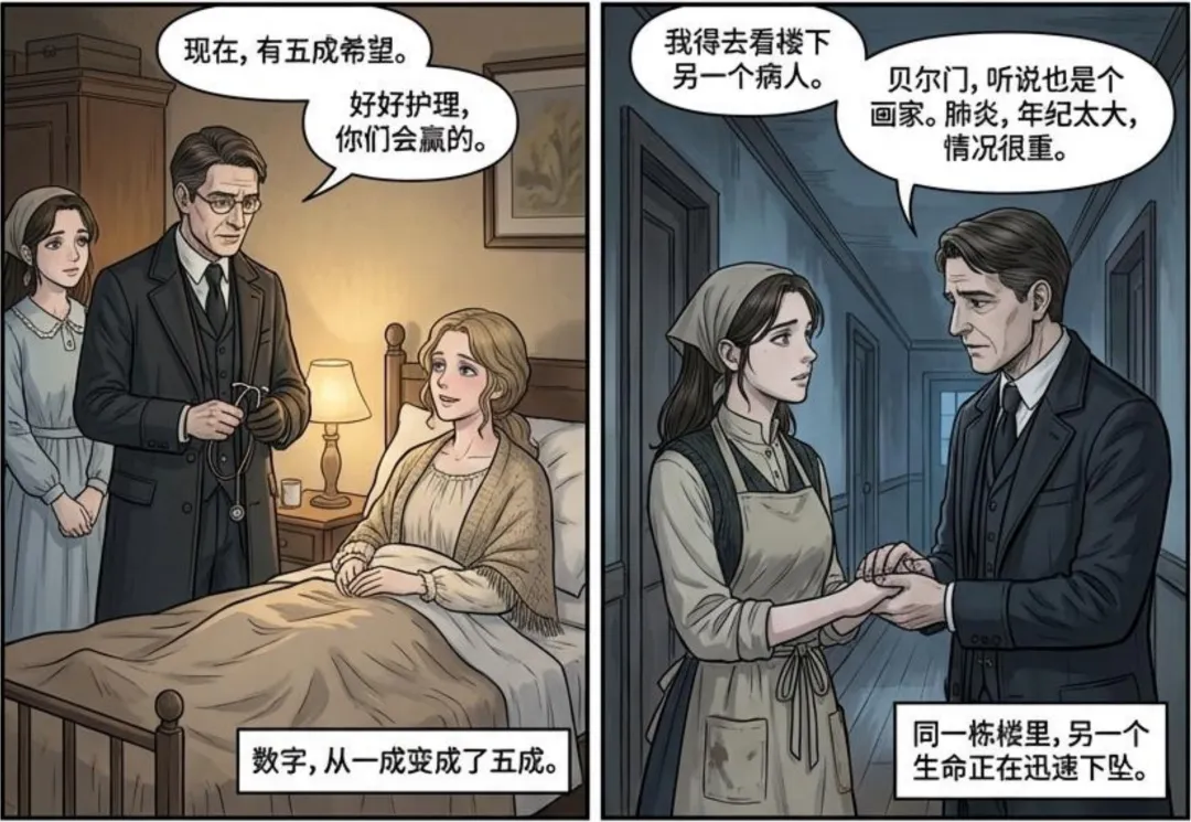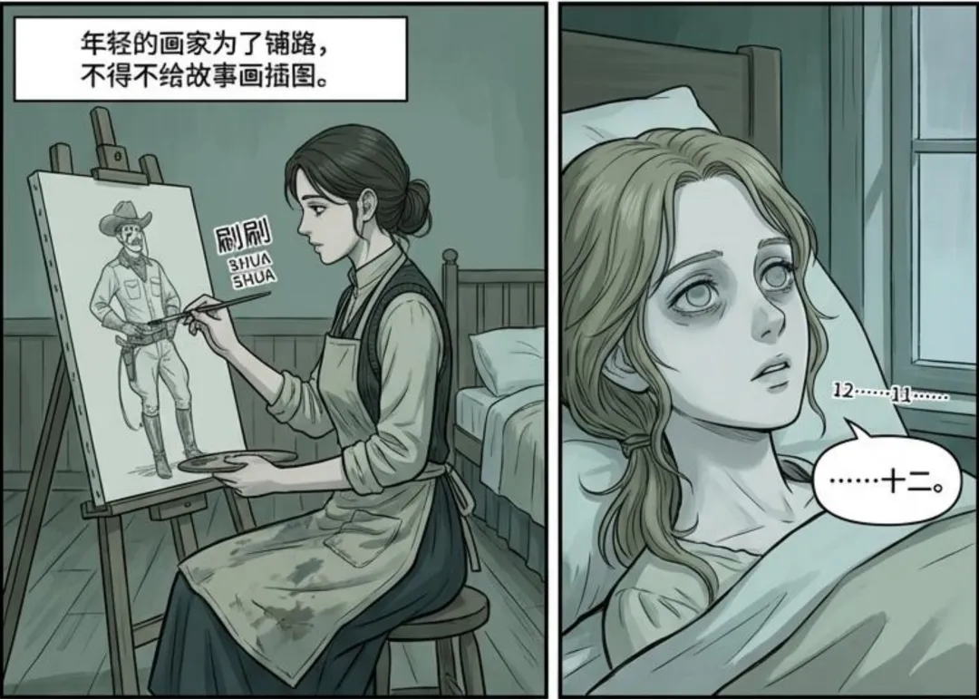 画面感极强 :老画家、病房女孩、窗外枯藤、阴冷雨夜、20世纪初纽约街区,自带天然漫画分镜感,可直观检验AI画面还原度;