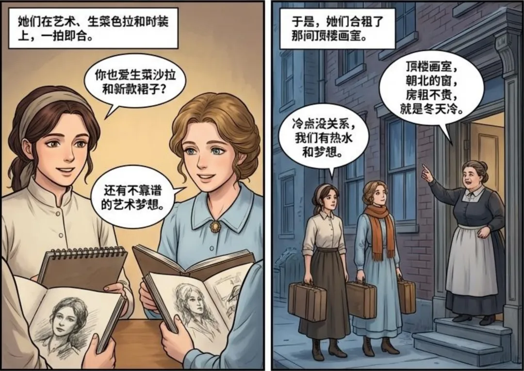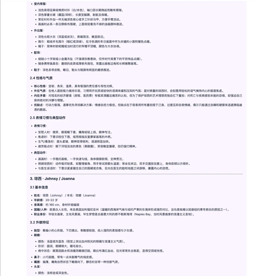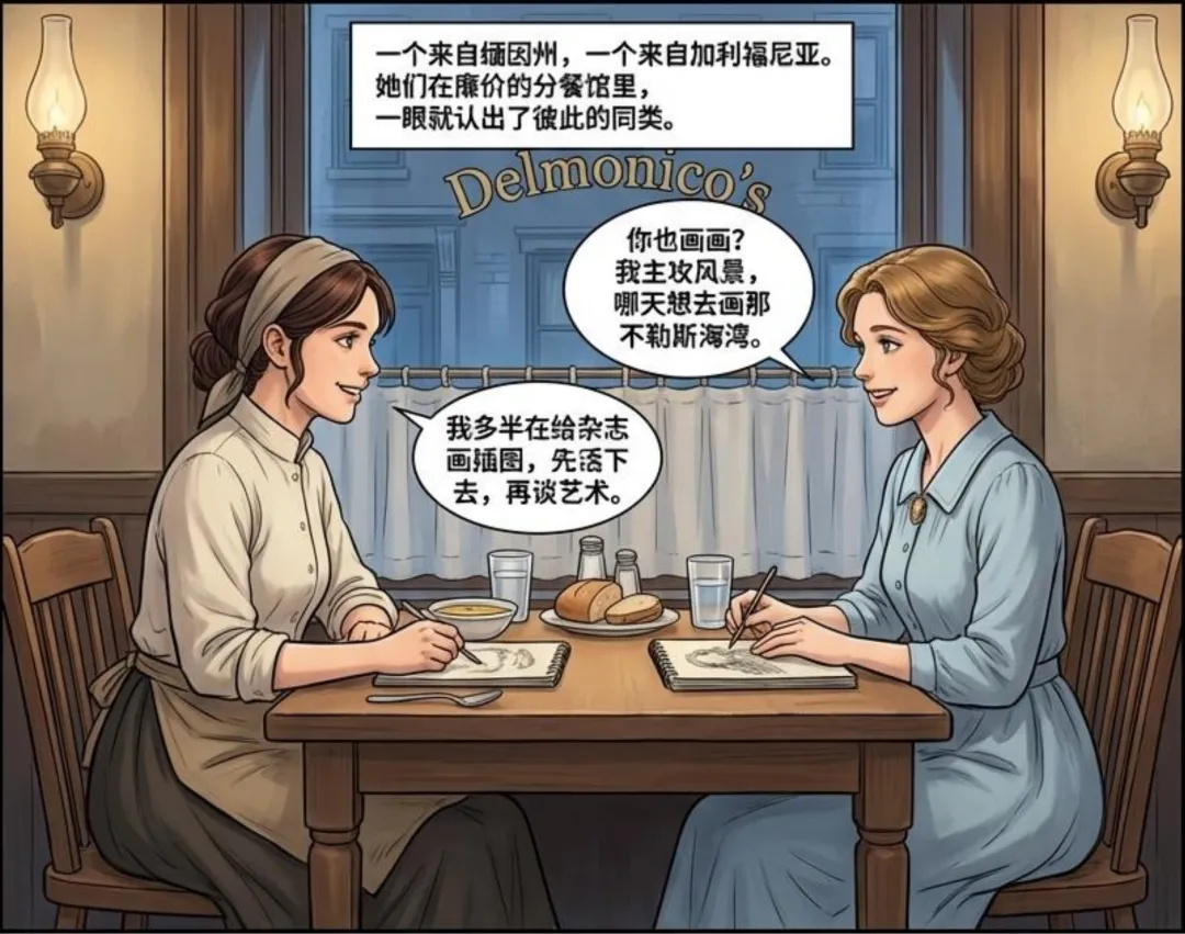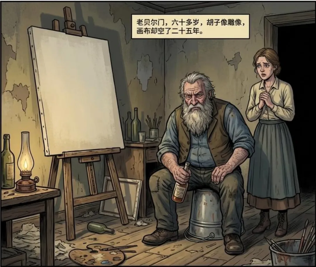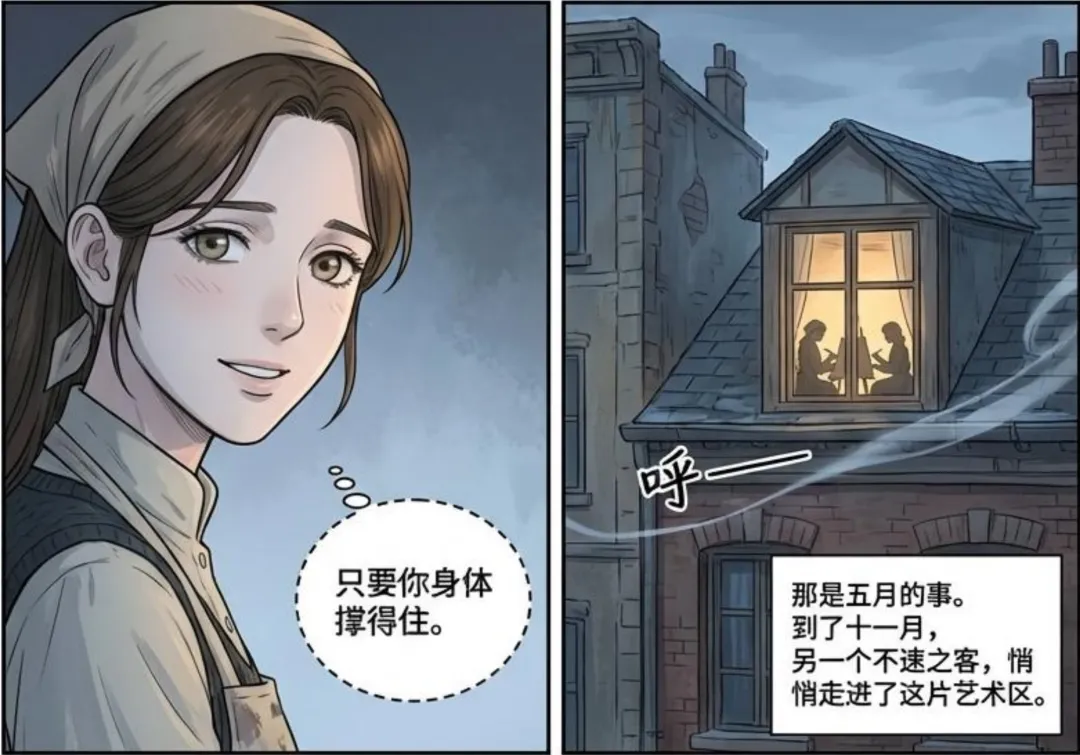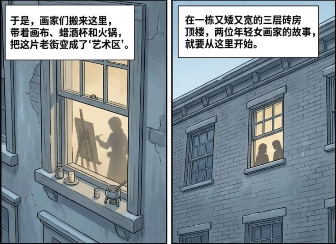 画面感极强 :老画家、病房女孩、窗外枯藤、阴冷雨夜、20世纪初纽约街区,自带天然漫画分镜感,可直观检验AI画面还原度;