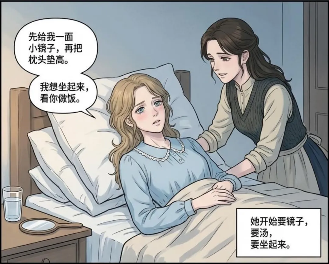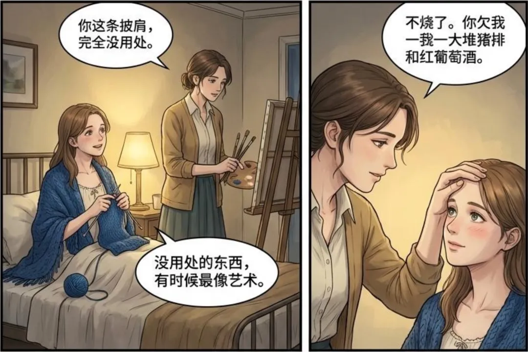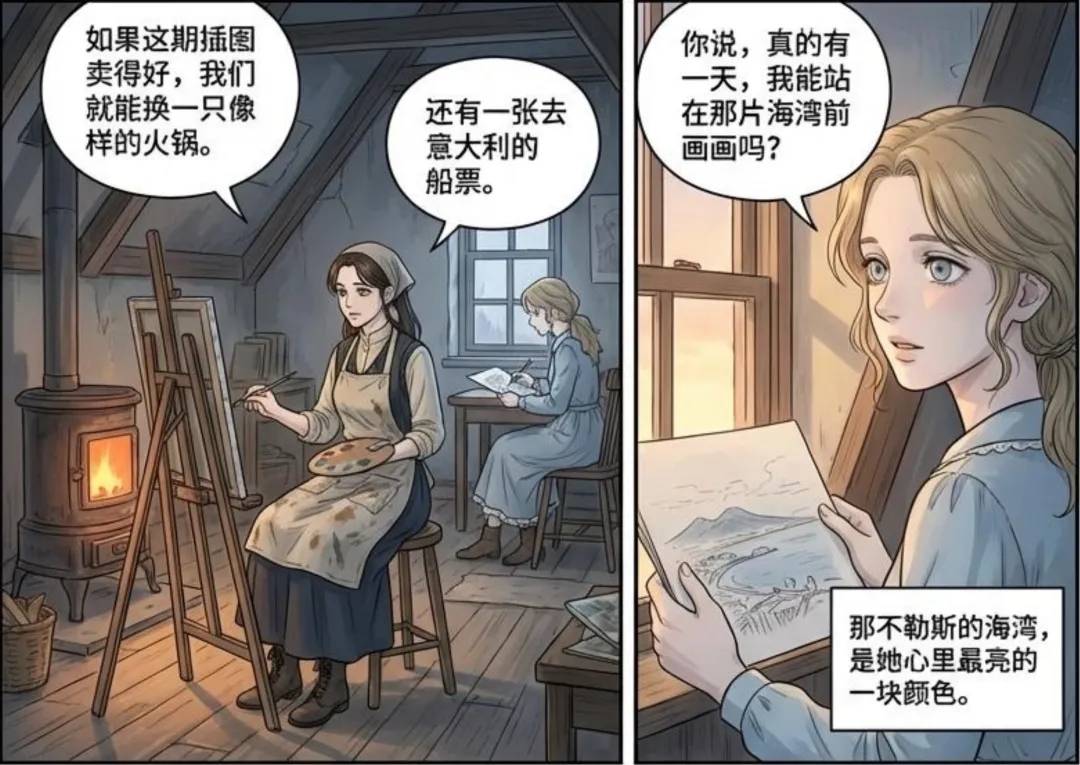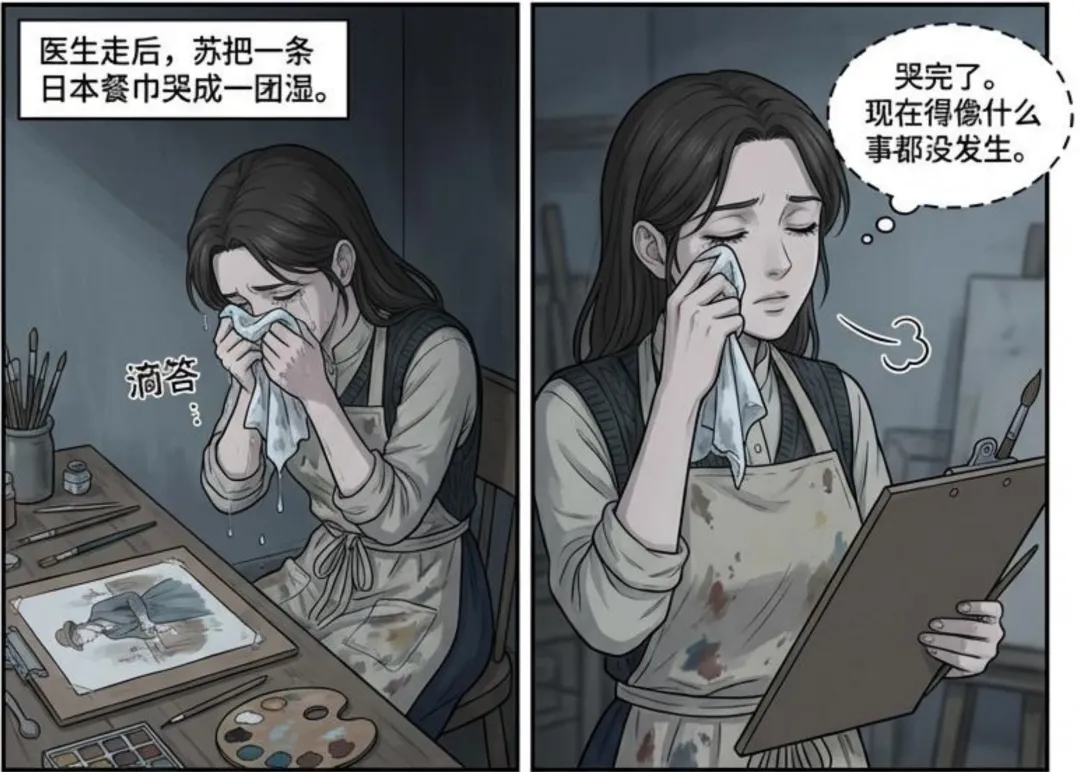 本次生成的漫画完成度极高,挑选3张核心画面,细节与情绪均精准贴合原作精髓,展现AI对故事的深度解读: