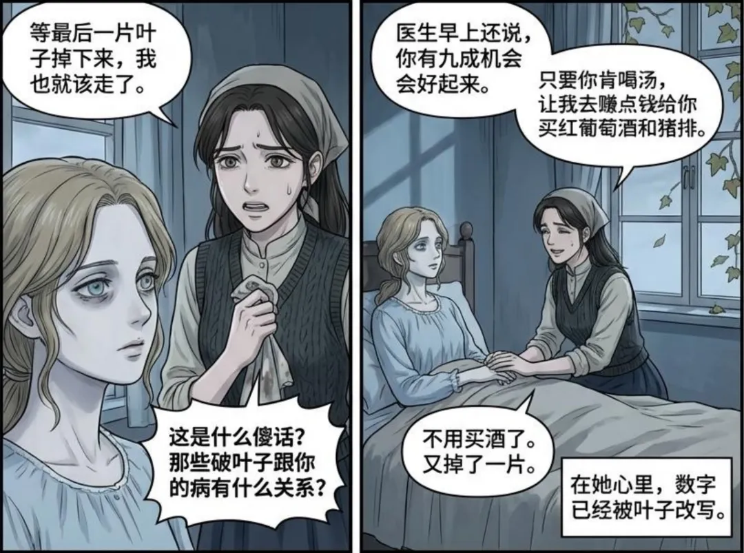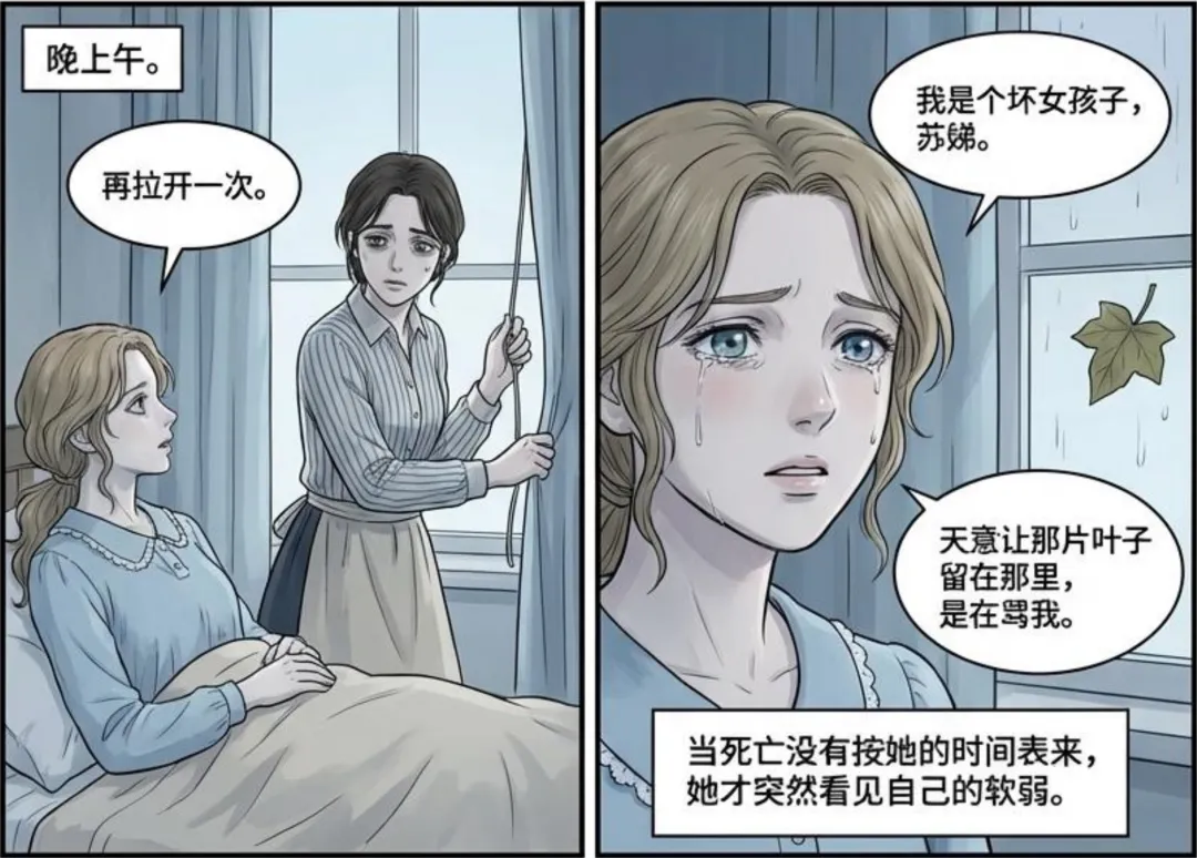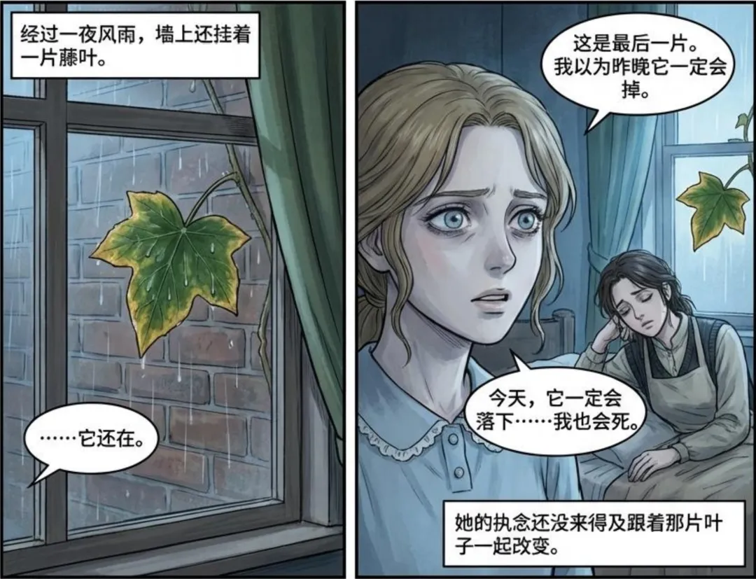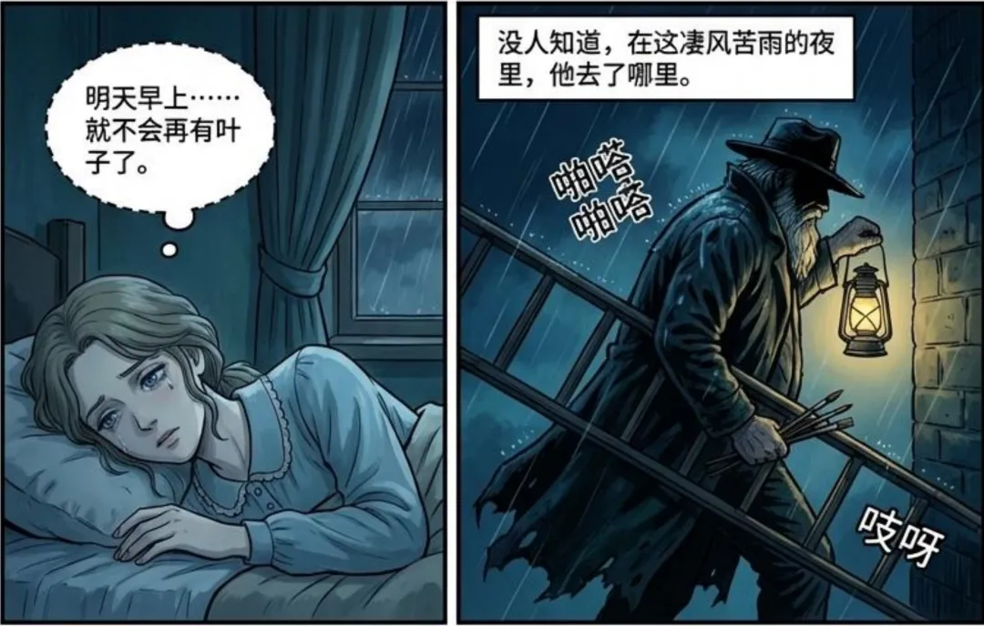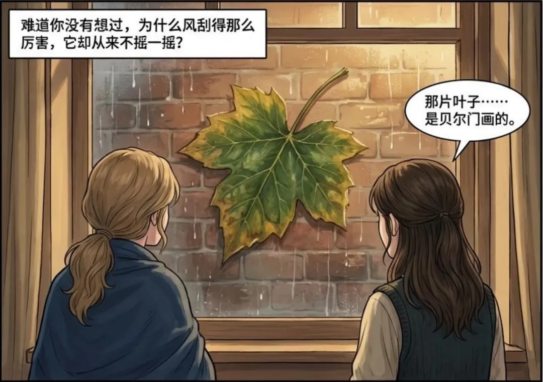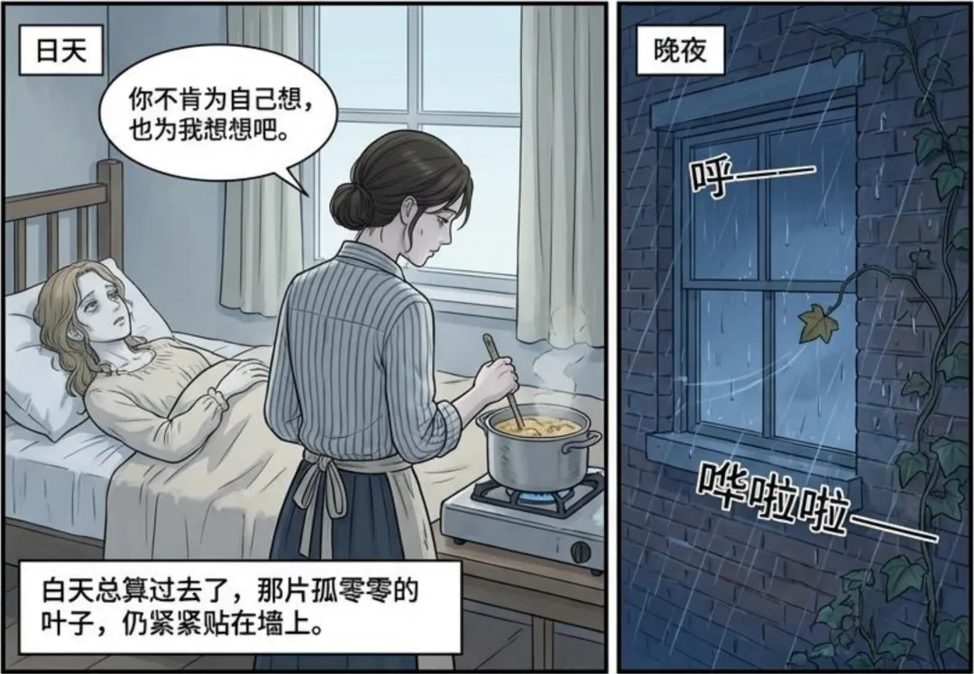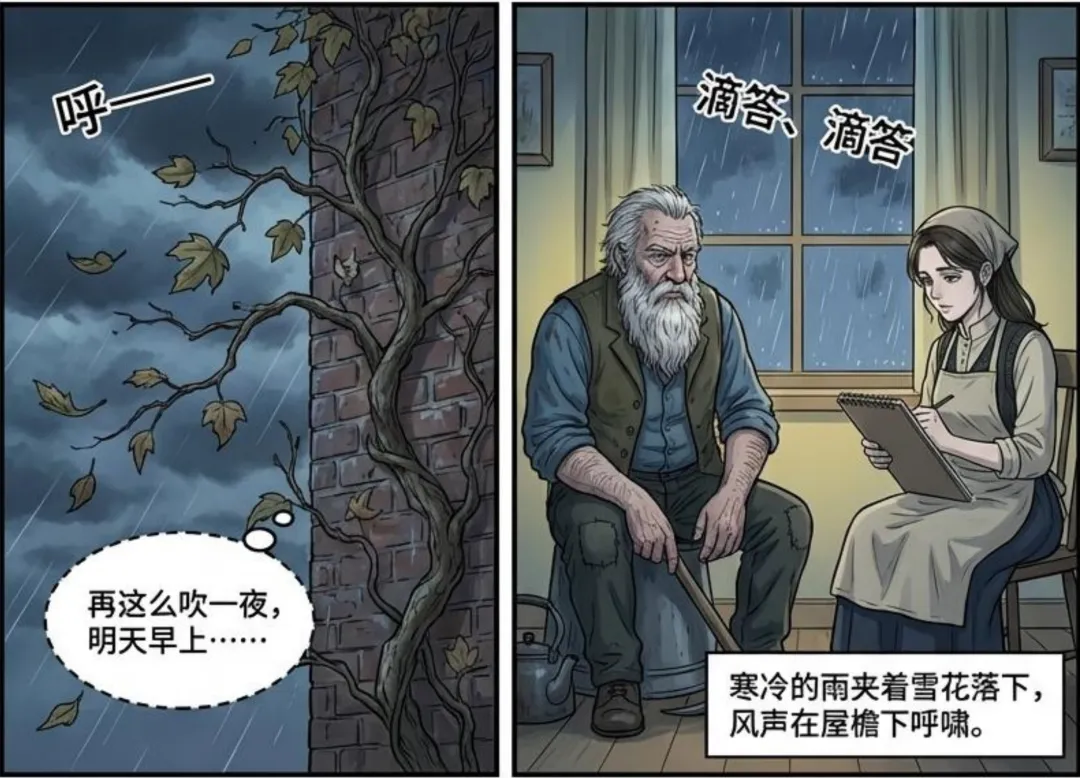 亮点 :雨夜过后,藤叶依旧挂在枝头,与琼西“它落我就死”的绝望形成强烈反差,埋下真相伏笔;冷色调+雨水质感,烘托出压抑又暗藏希望的氛围,贴合“前冷后暖”的叙事基调;琼西苍白憔悴的神态,直观展现她将生命寄托于枯叶的脆弱。