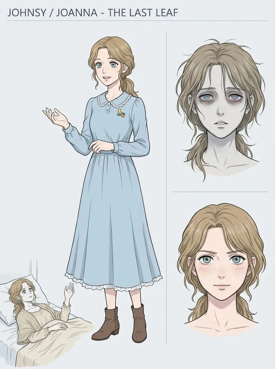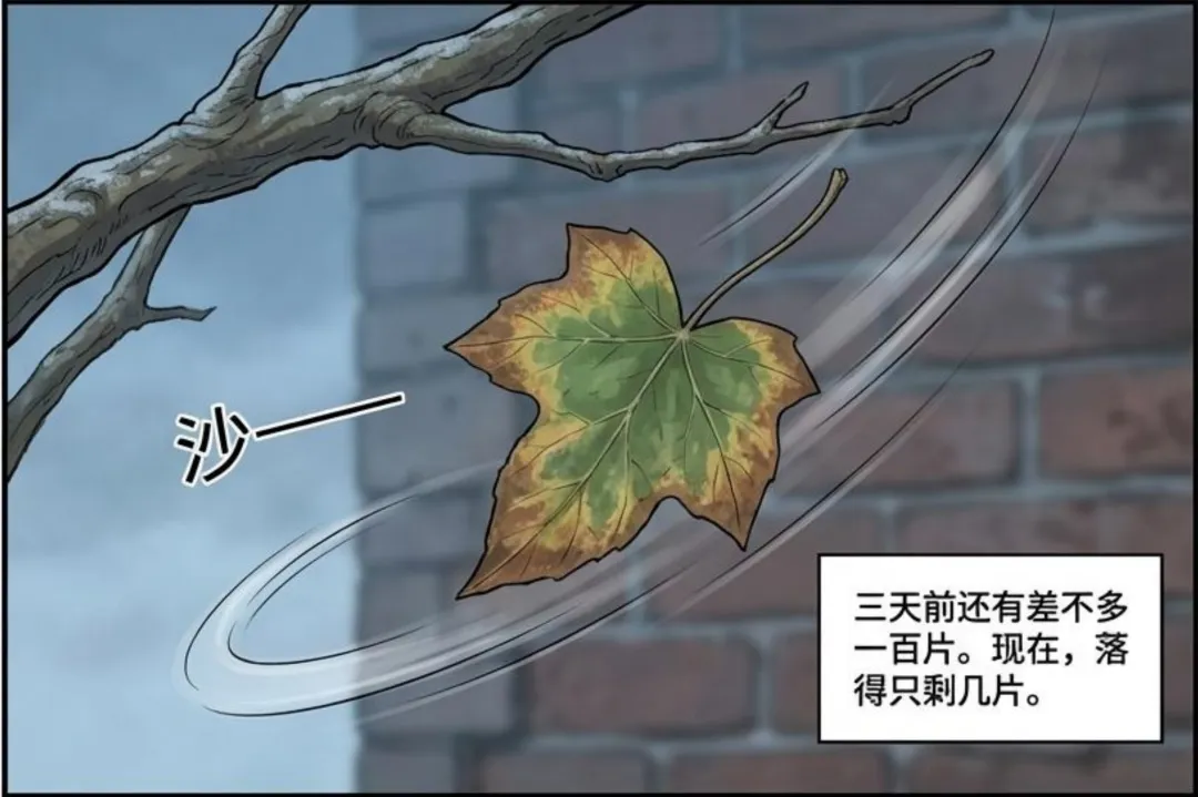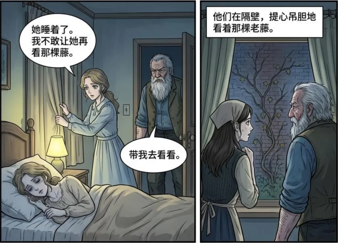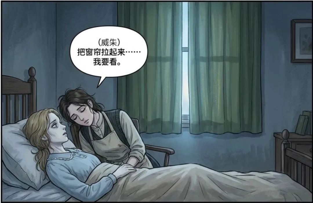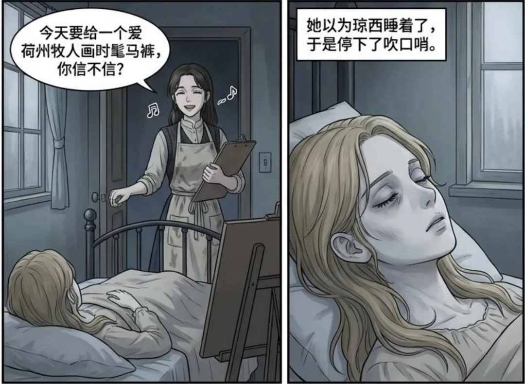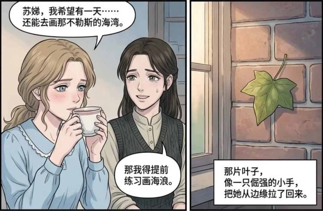 亮点 :雨夜过后,藤叶依旧挂在枝头,与琼西“它落我就死”的绝望形成强烈反差,埋下真相伏笔;冷色调+雨水质感,烘托出压抑又暗藏希望的氛围,贴合“前冷后暖”的叙事基调;琼西苍白憔悴的神态,直观展现她将生命寄托于枯叶的脆弱。