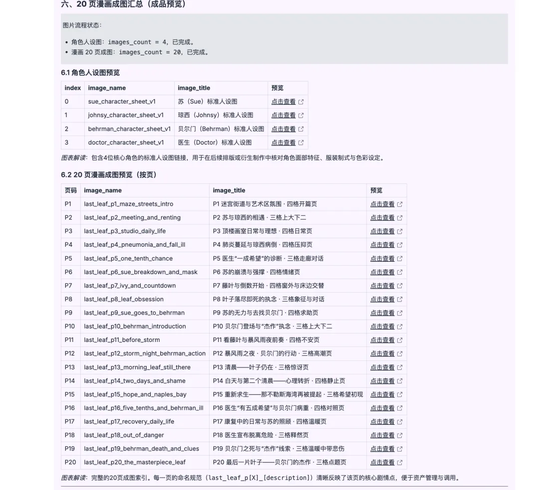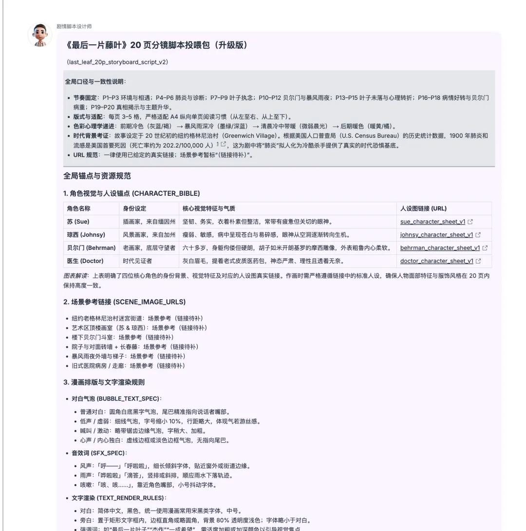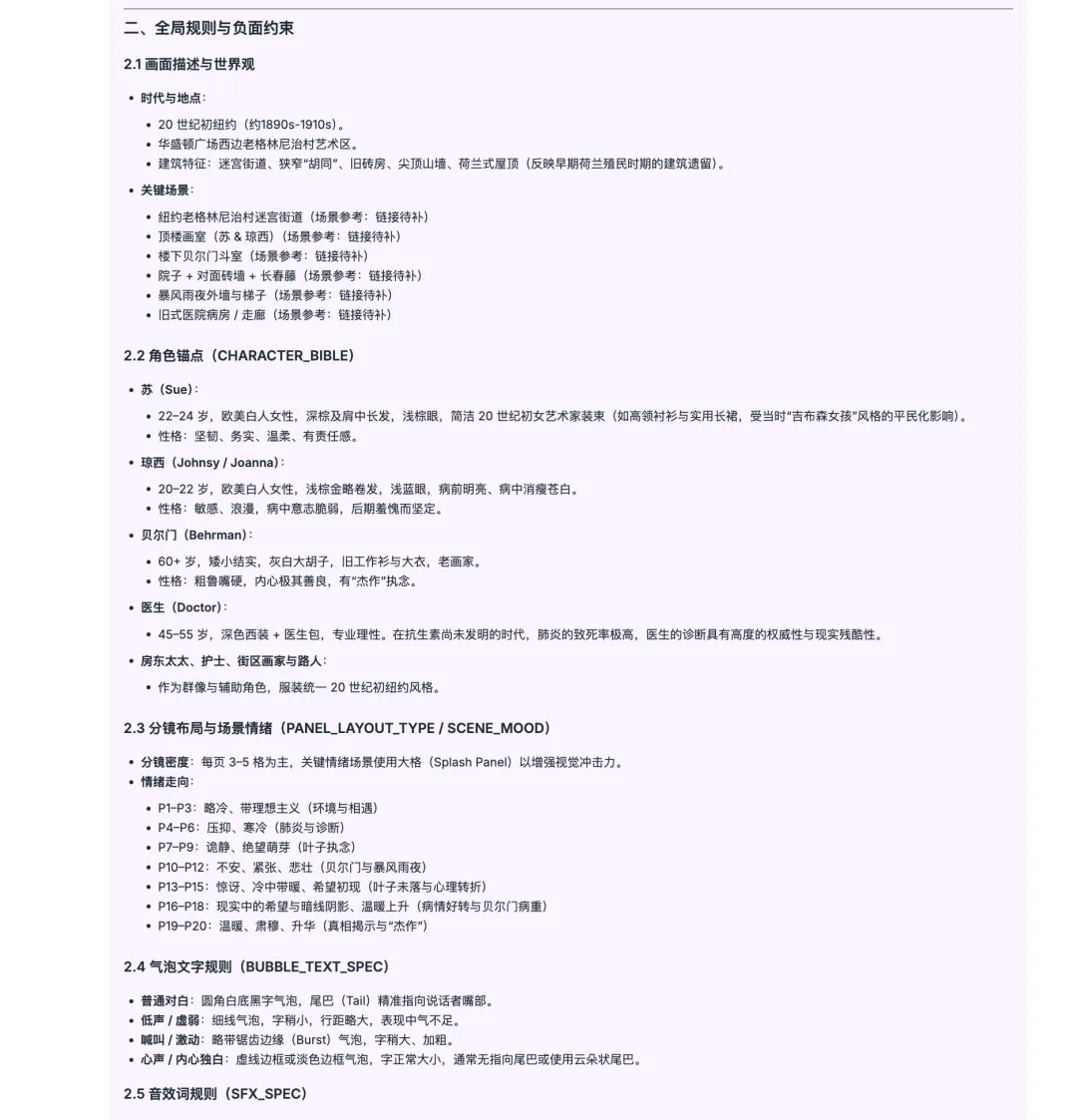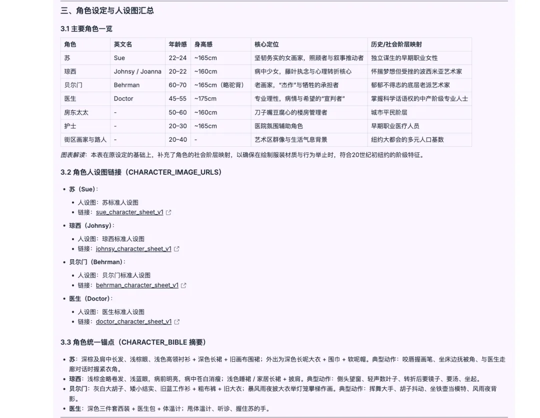 AI自动敲定全局创作规则:固定20页篇幅、20世纪初纽约背景、欧美风人设、色调冷暖递进、对白旁白统一风格,为后续创作筑牢框架;同时精准梳理苏、琼西、贝尔门、医生四大核心角色,细化外貌、服装、性格设定,绘制统一画风人设图,彻底解决传统AI漫画“换脸”的痛点,人物辨识度拉满。