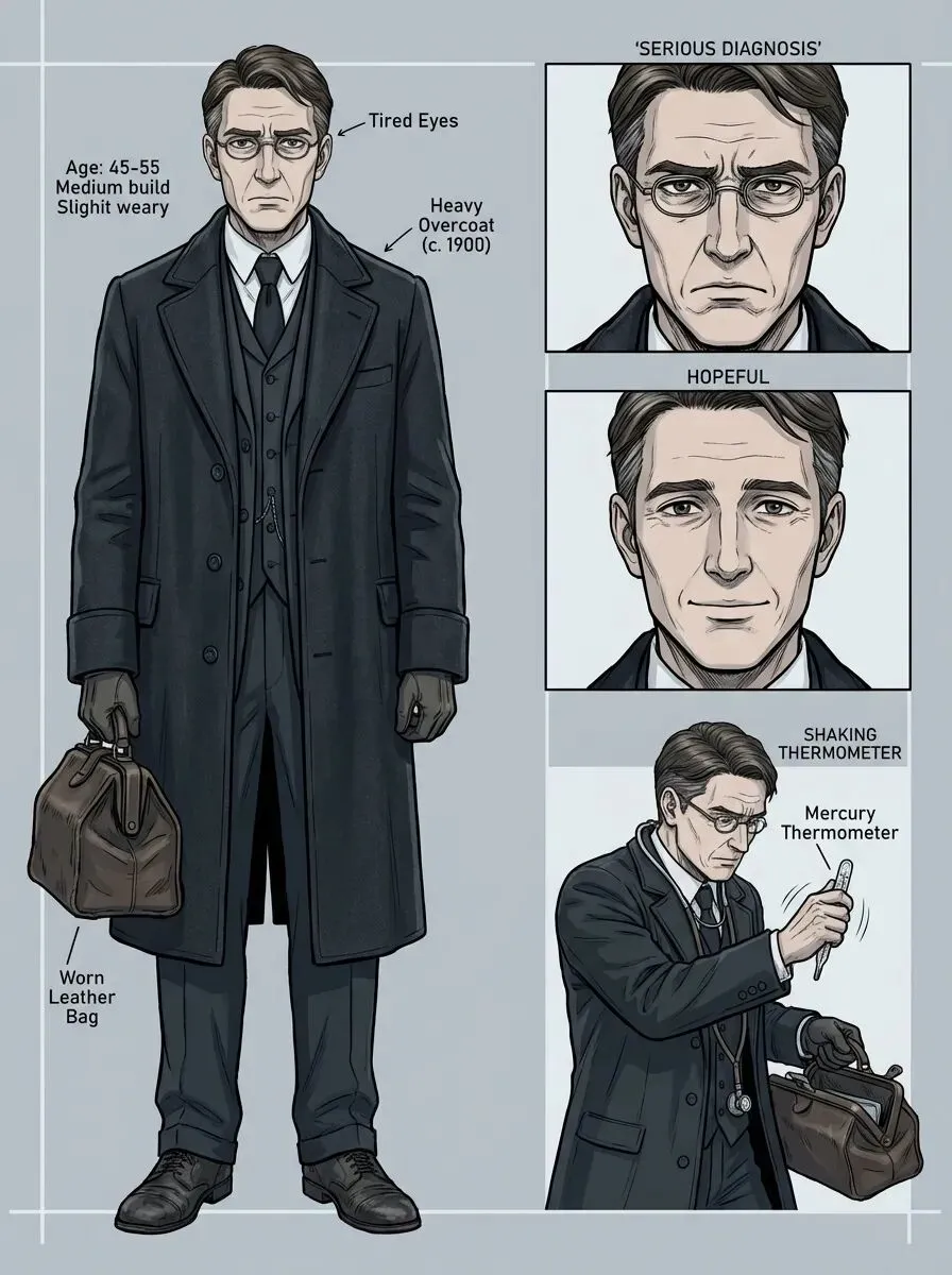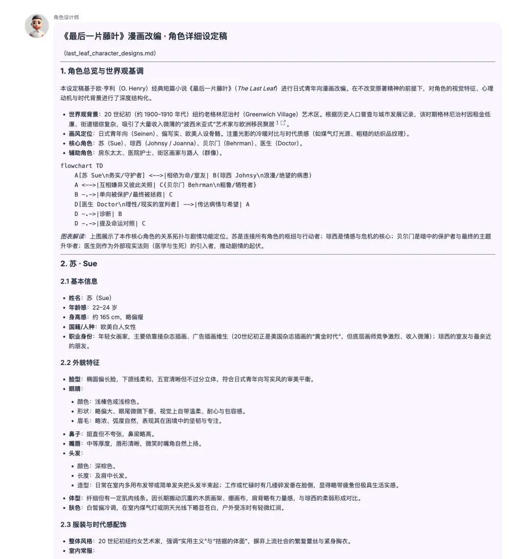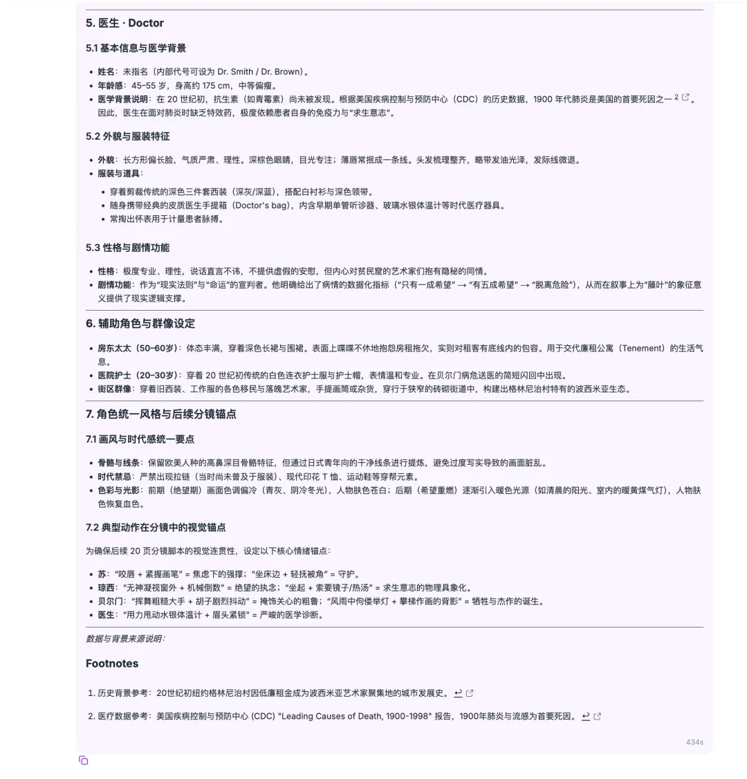 AI自动敲定全局创作规则:固定20页篇幅、20世纪初纽约背景、欧美风人设、色调冷暖递进、对白旁白统一风格,为后续创作筑牢框架;同时精准梳理苏、琼西、贝尔门、医生四大核心角色,细化外貌、服装、性格设定,绘制统一画风人设图,彻底解决传统AI漫画“换脸”的痛点,人物辨识度拉满。