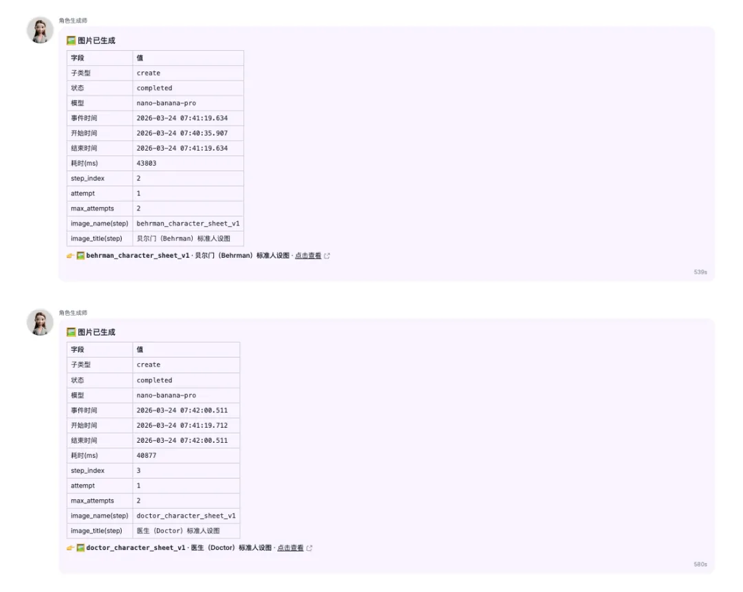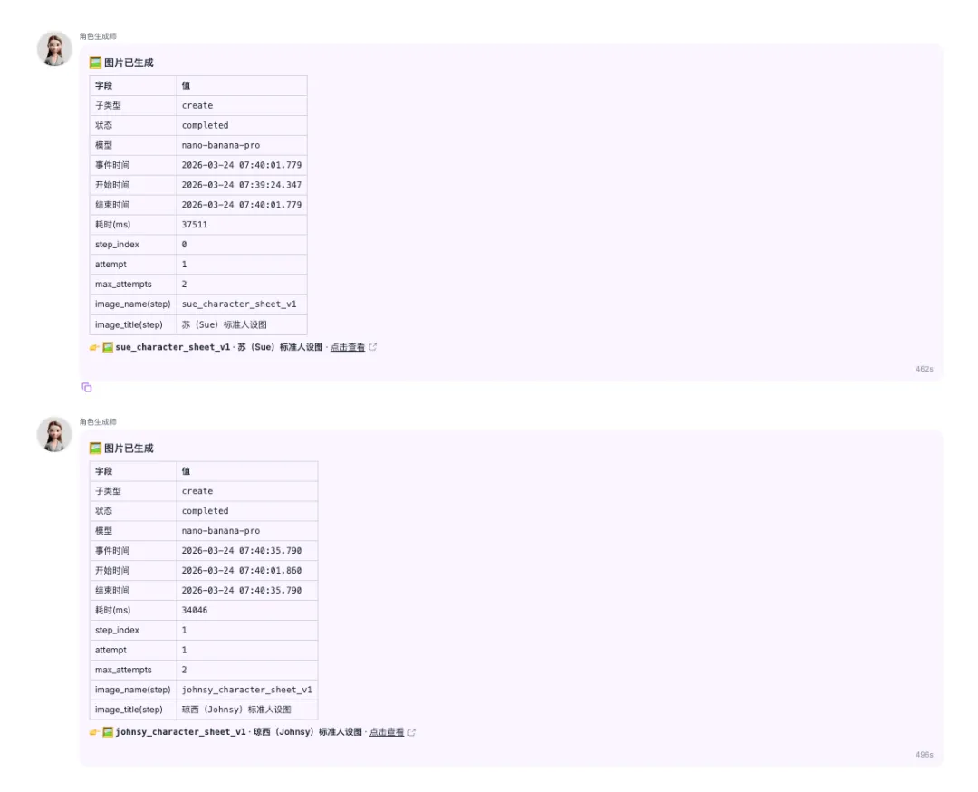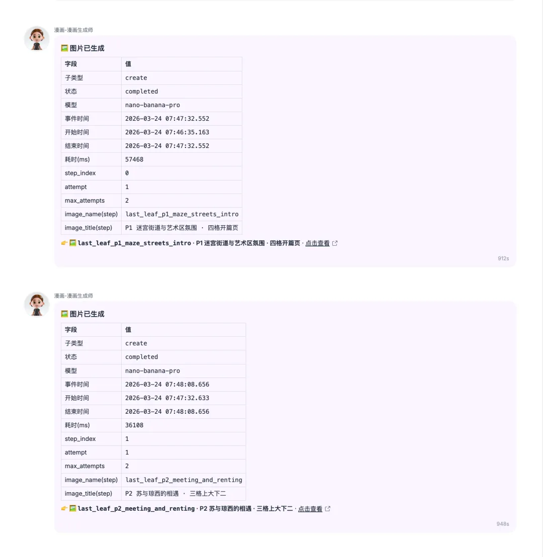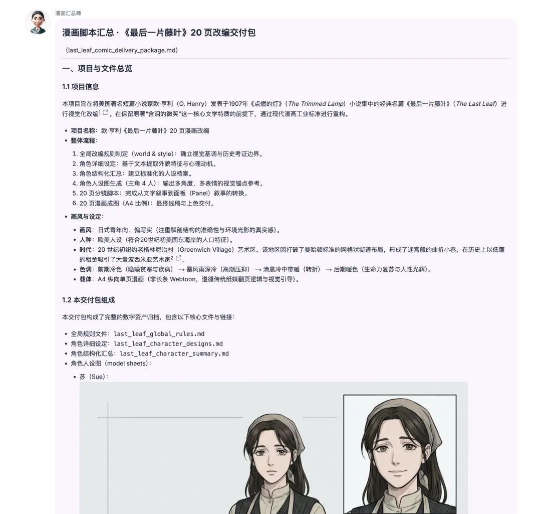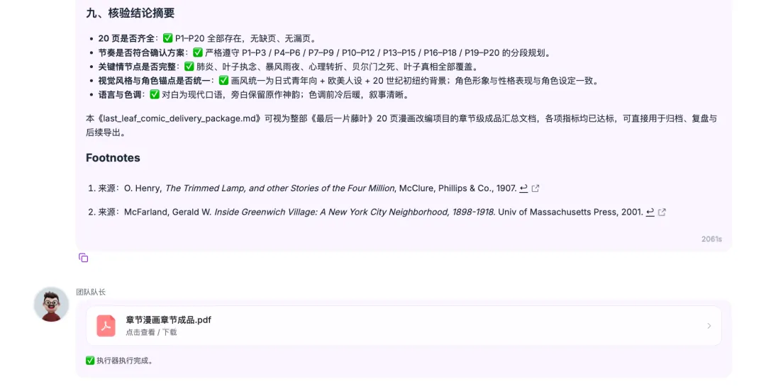 可以看到 「 剧情脚本设计师 」 先深度理解故事内核,完成章节规划与分镜设计,再交由 「漫画生成师」 进行画面制作;完成后由 「 漫画汇总师 」 整合全片内容,最后由队长统一输出 PDF 交付。