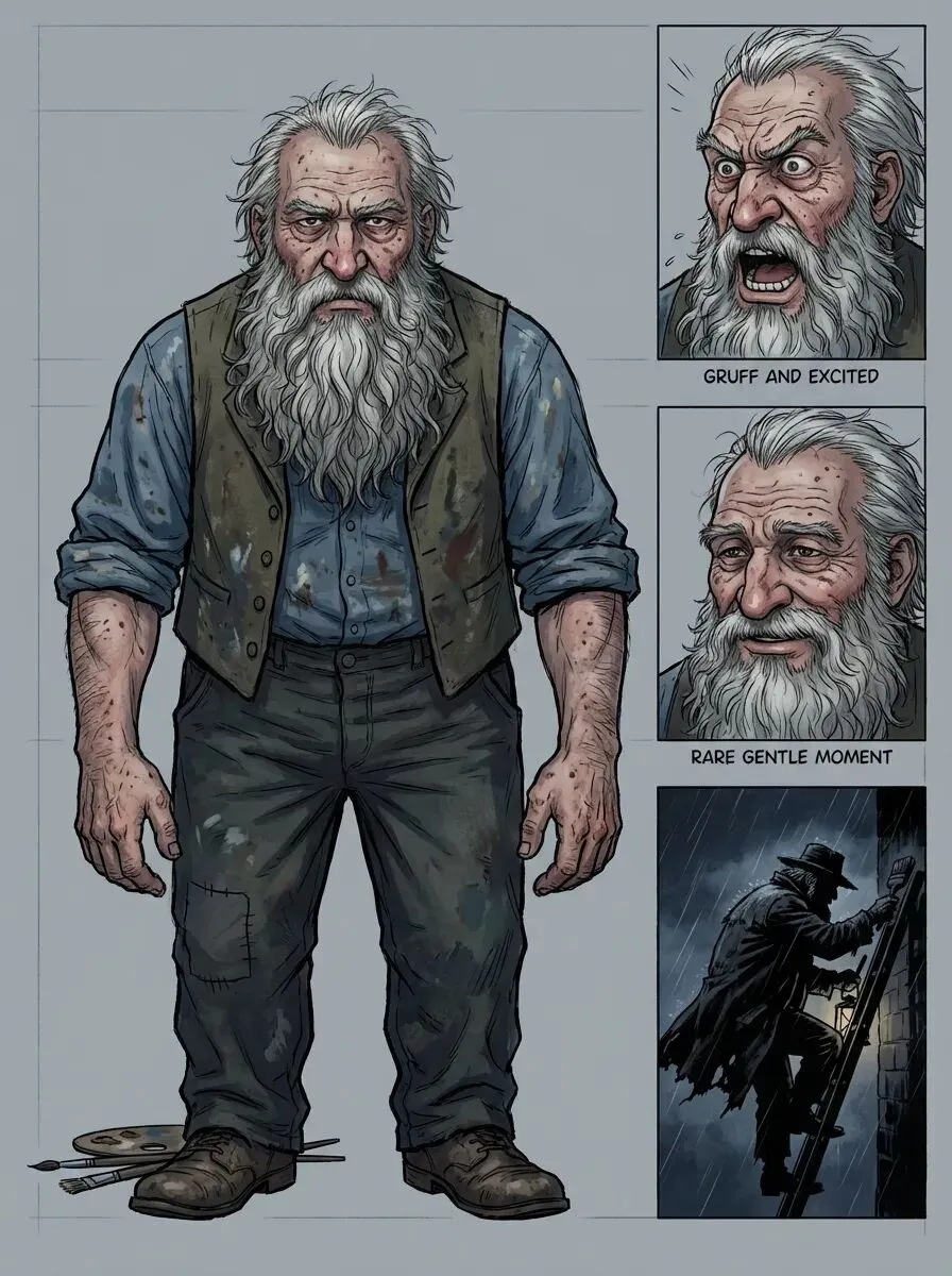 亮点 :精准刻画贝尔门“嘴硬心软”的反差感,表面暴躁怒骂、神态凶狠,内心却将两个女孩视作软肋,神态从激烈到沉重的递进,完美展现底层小人物的温柔与担当;硬朗线条+复古色调,贴合20世纪初纽约背景,粗粝笔触中藏满温情。