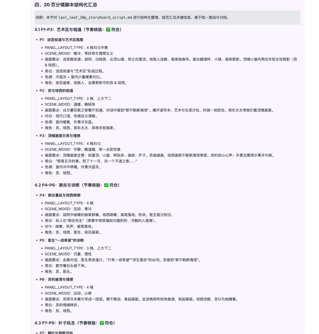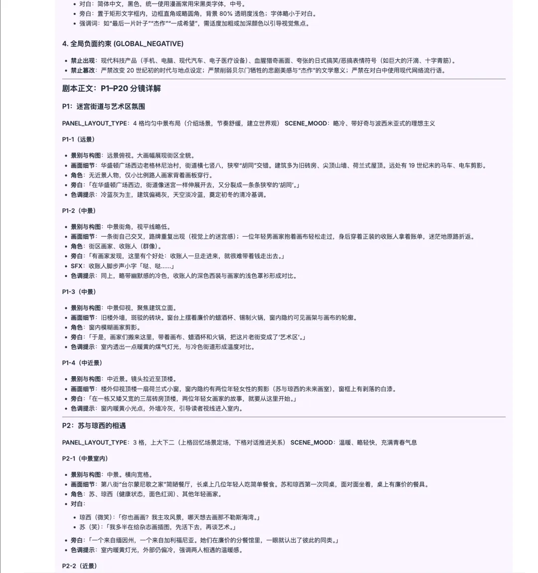 AI自动编写20页分镜脚本,逐页规划构图、景别、角色动作、台词旁白、色调提示,完整覆盖全文关键剧情;再依据分镜与人设,绘制A4比例全套漫画,保持日式写实质感,贴合时代背景,色调前冷后暖,精准呼应故事情绪起伏。