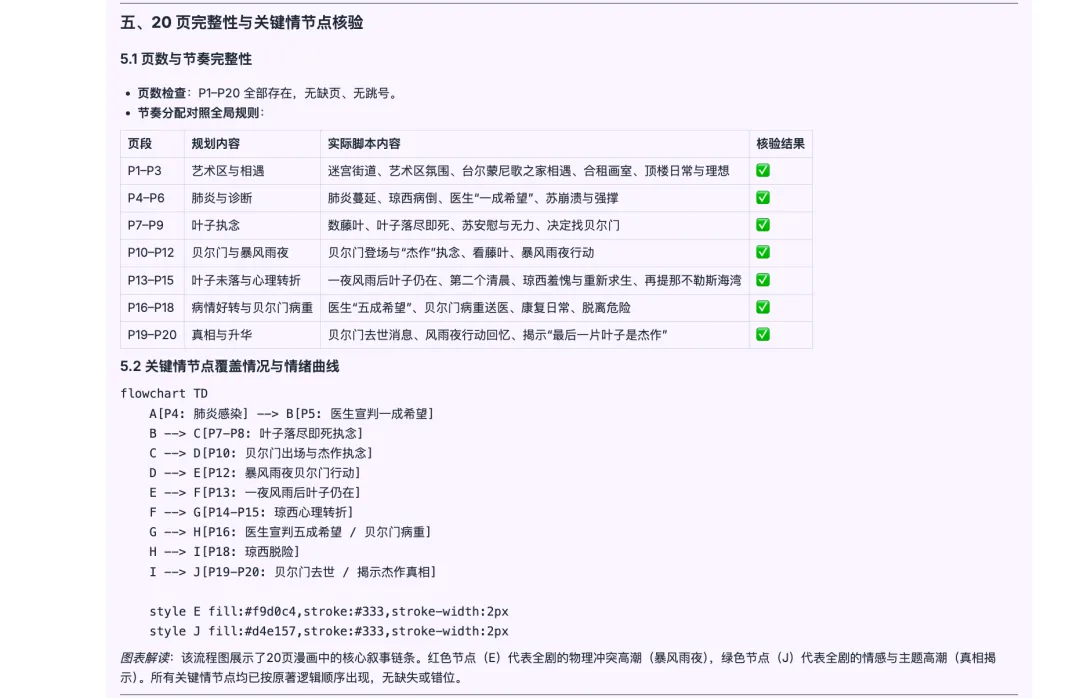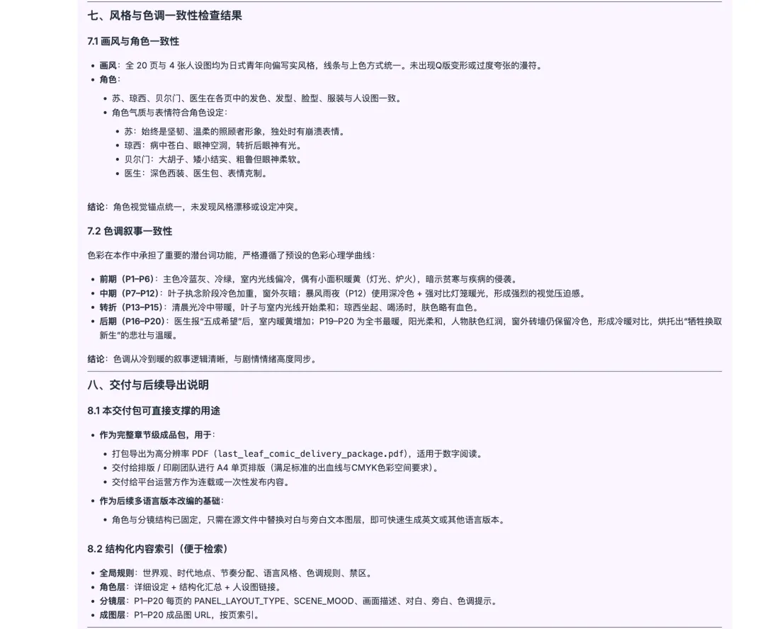 AI自动核查页数、节奏、剧情、画风统一性,整合20页成图,导出最终PDF成品包,完成项目验收。全程无需手动拆章节、标重点、写复杂提示词,真正实现“一键生成”。