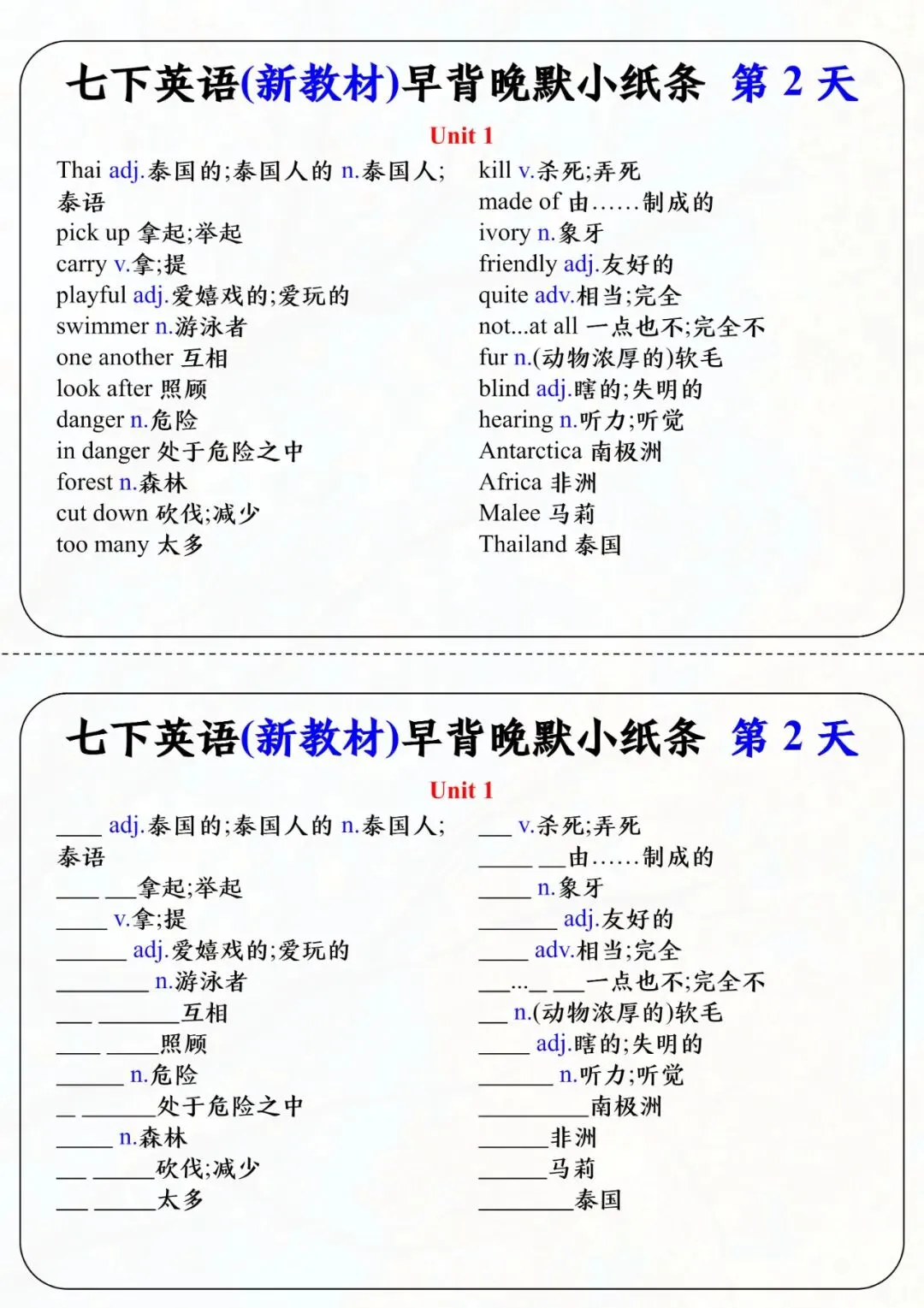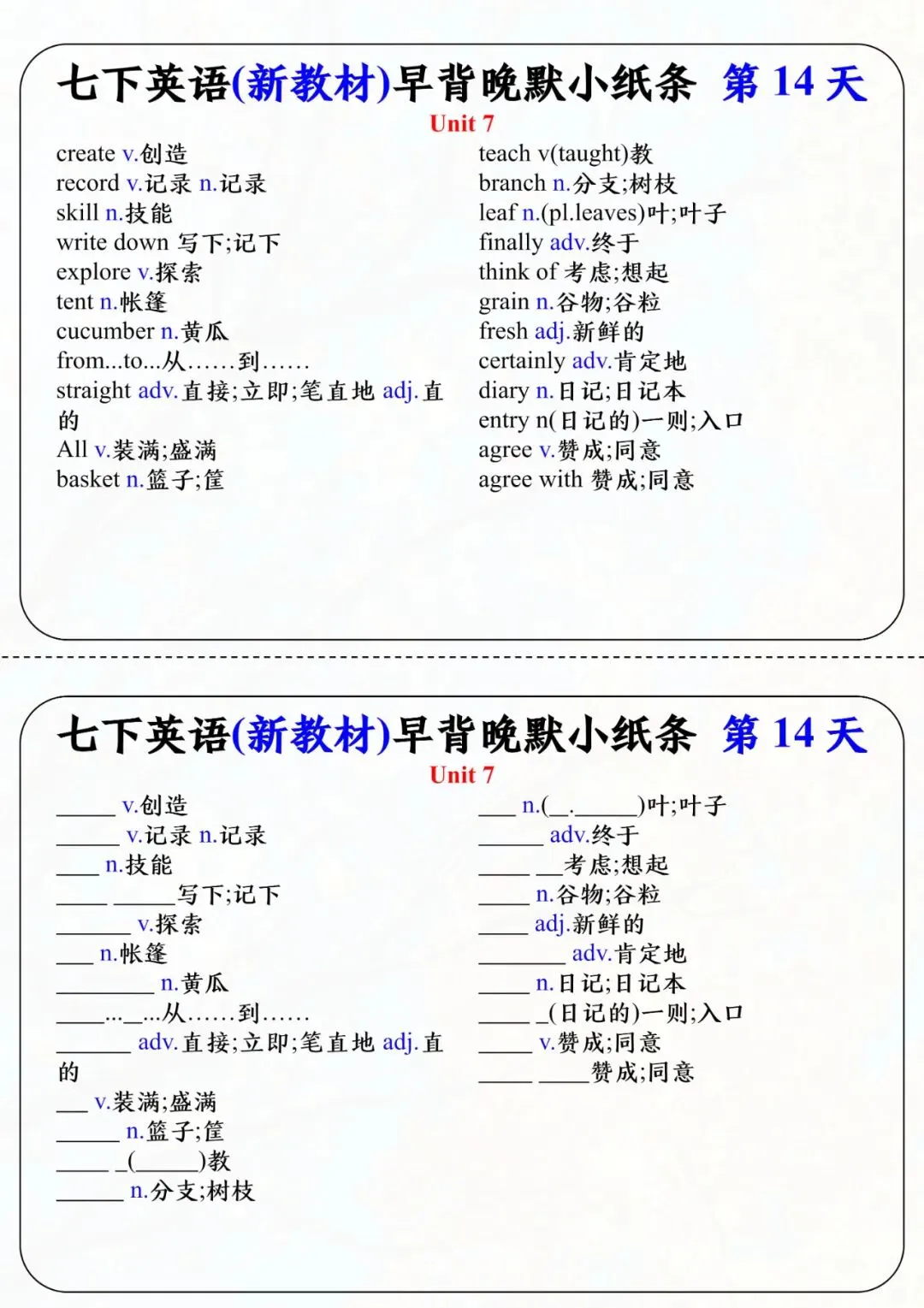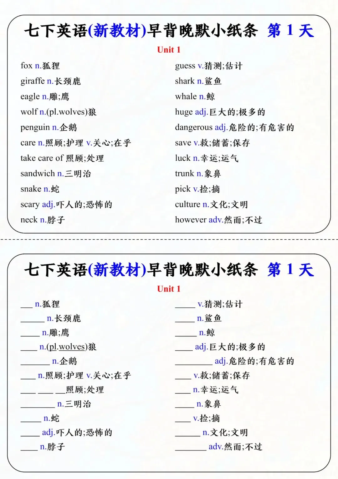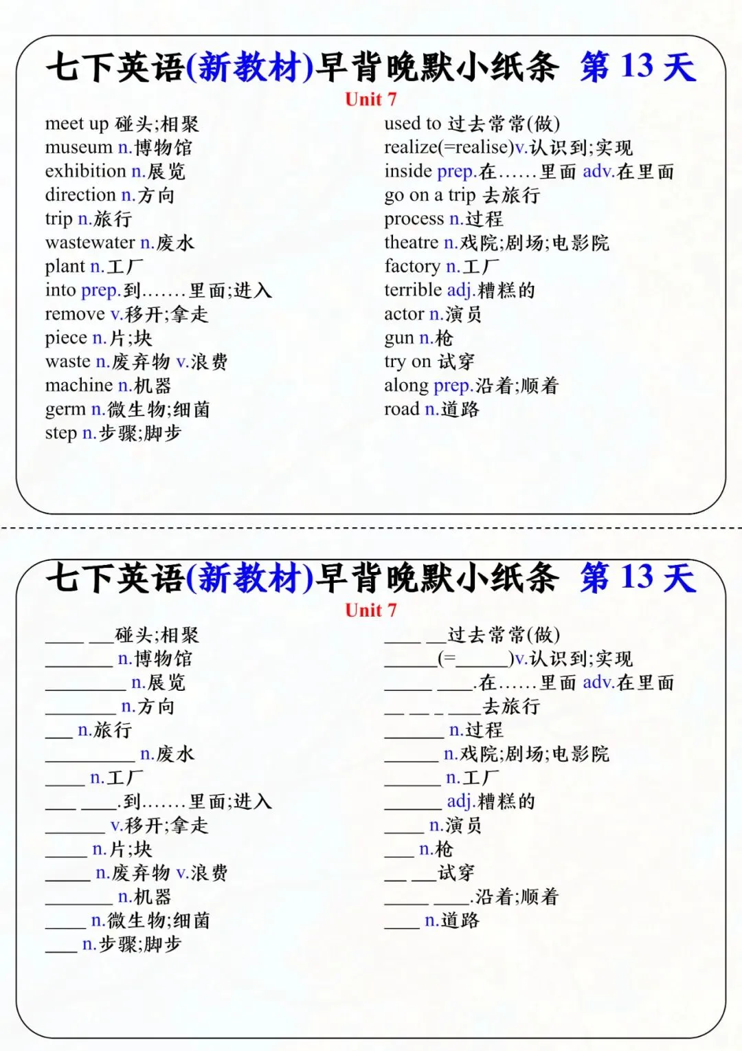 今天老师给大家整理了:七年级下册英语单词早背晚默小纸条电子版可打印!
