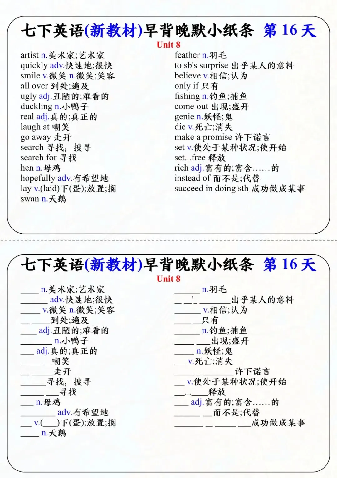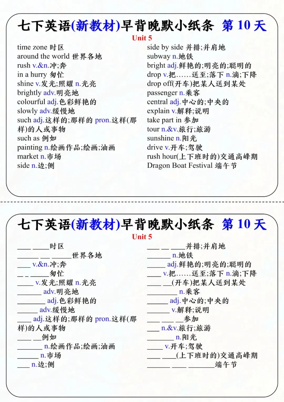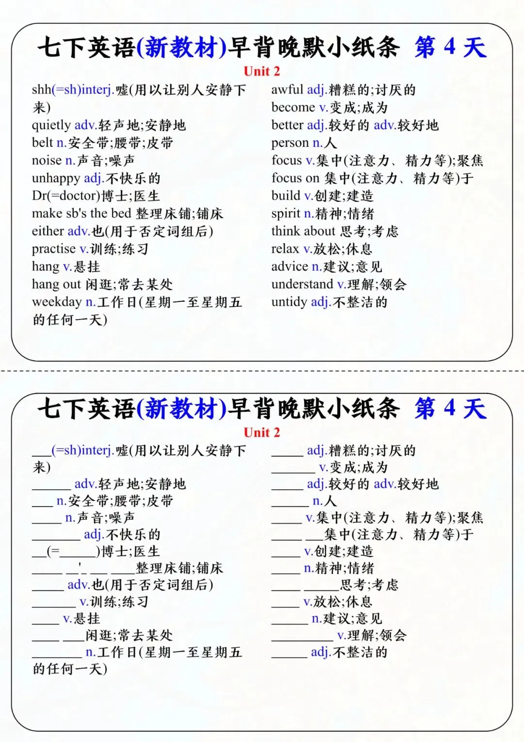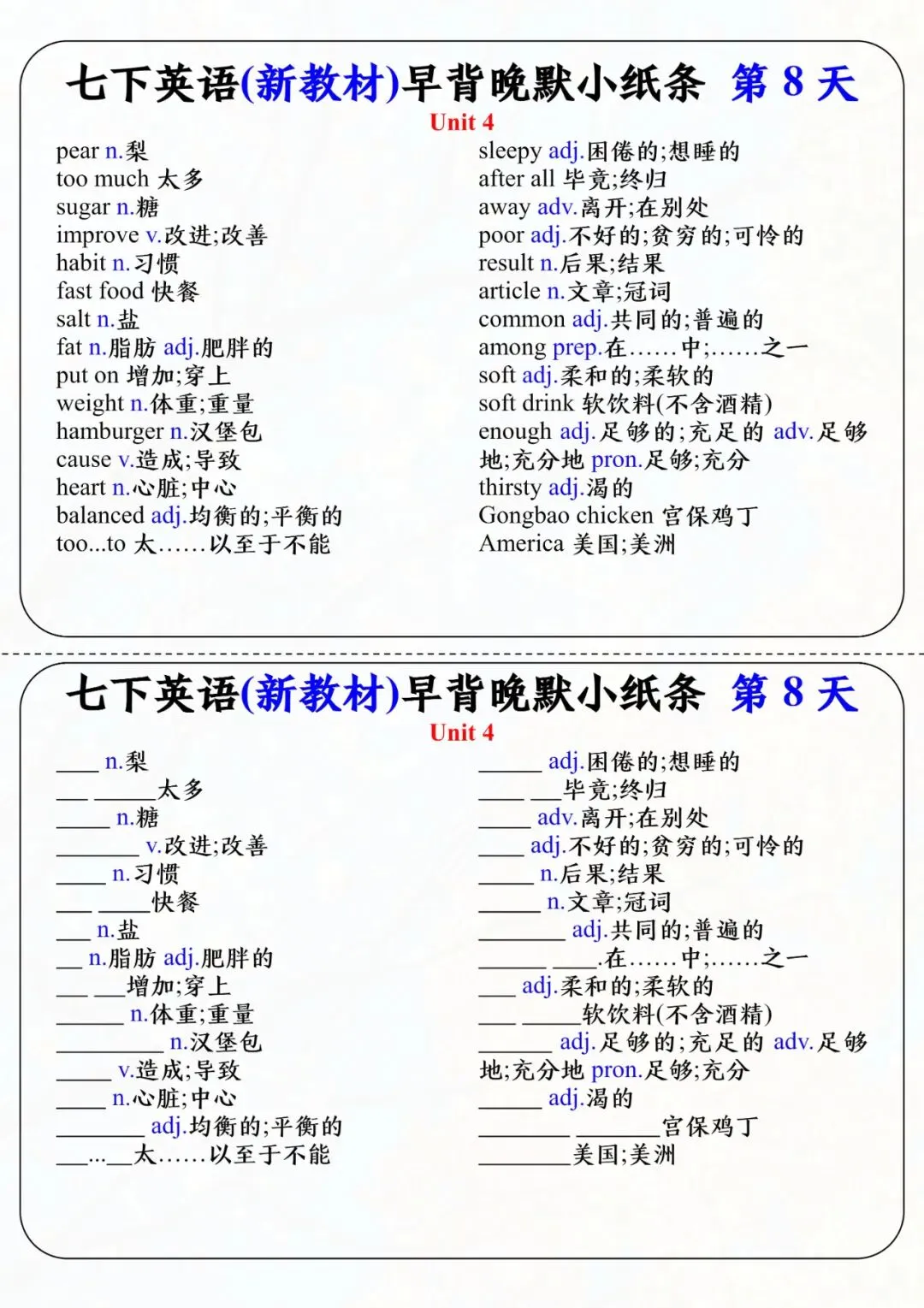 今天老师给大家整理了:七年级下册英语单词早背晚默小纸条电子版可打印!