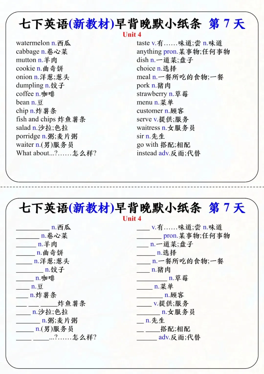 七年级下册英语单词早背晚默小纸条电子版可打印