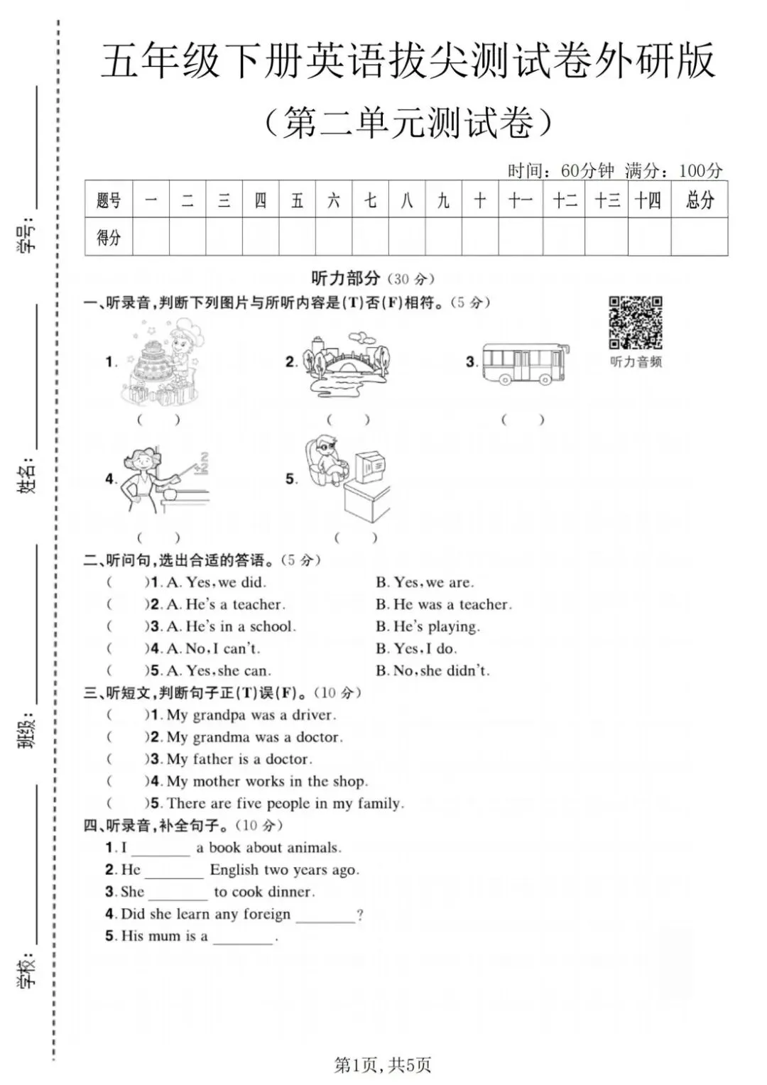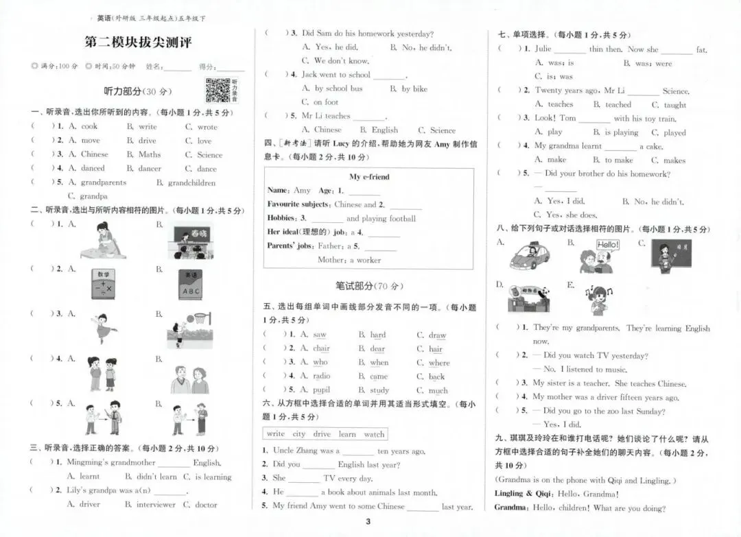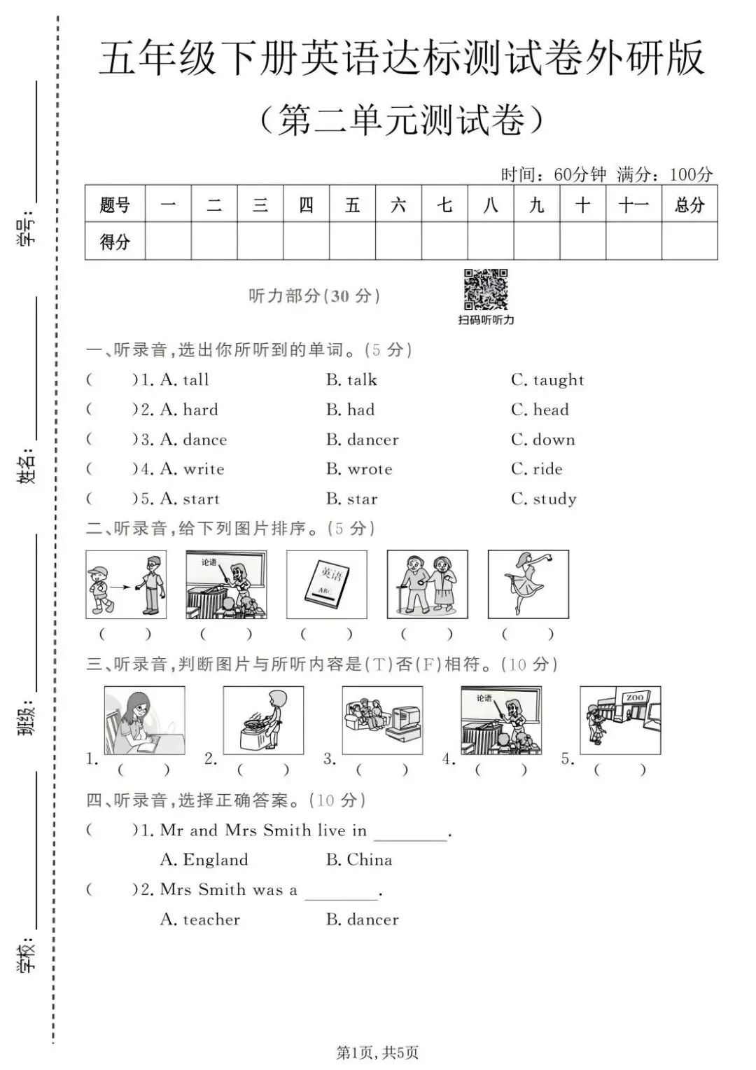 26春外研版五年级下册英语《第二单元质量测试卷》,共3套,含答案,电子版可打印。单元测试卷作为检测孩子的学习工具,帮助孩子查缺补漏、提升学习成绩。有需要的家长快打印给孩子练一练。