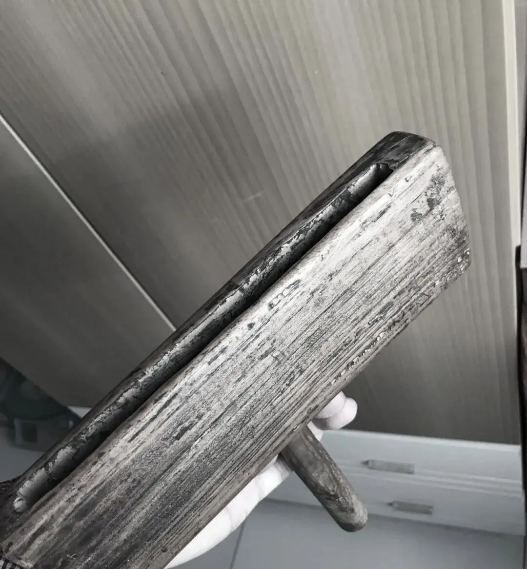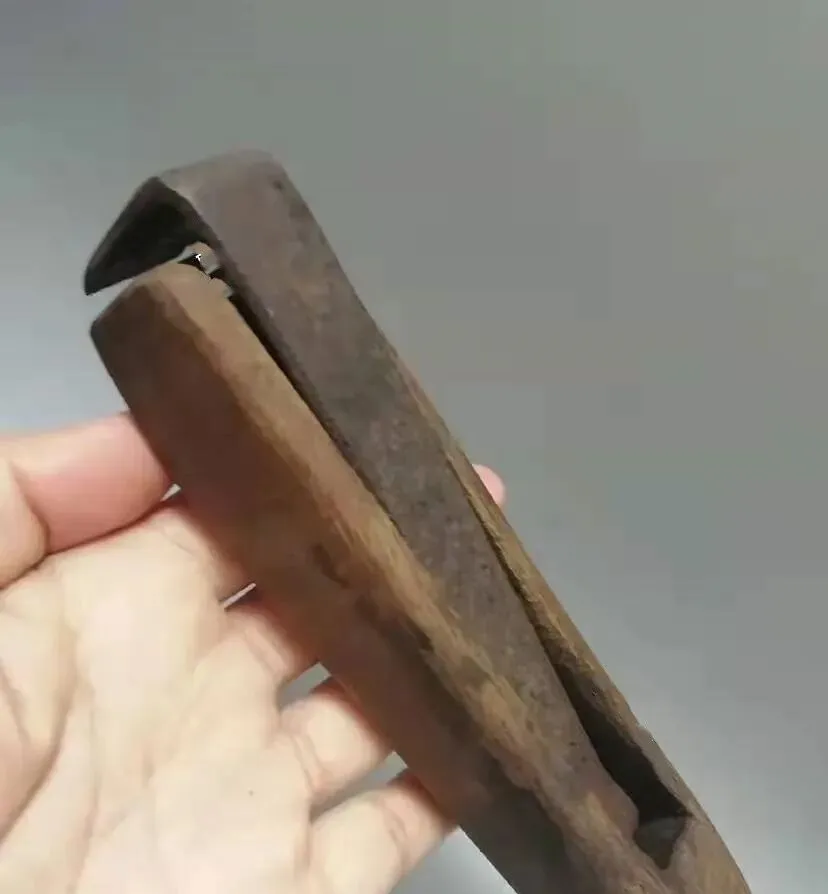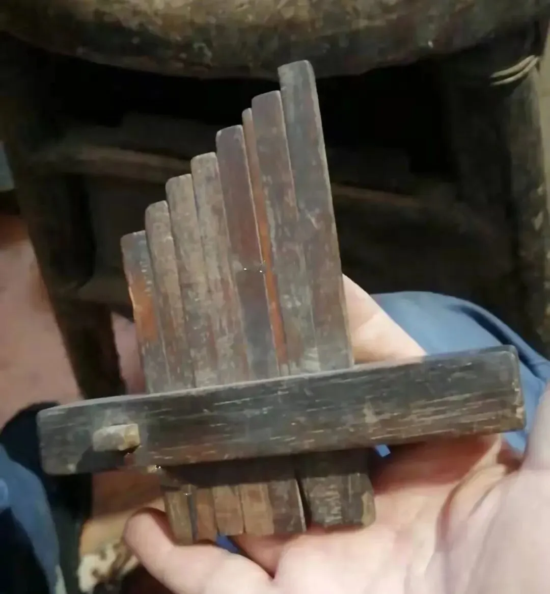 大哥大姐们,这玩意叫芘子,是木匠画直线用的长短尺,这可是个精细活的家伙什,你看这一条条小木片就是刻度,上头还钉着金属钉,用的时候把它贴着刨直的木头面往前推,跟刨直面平行的一条线就出来了,遇到缝隙也不用量,往里一塞就知道多宽,那小木片都是固定刻度的,没它木匠连个直线都画不利索,当年木匠师傅出门干活,这玩意是必带的宝贝,现在都用激光水平仪了,这老物件也就成摆设了。