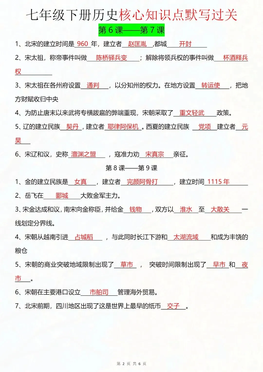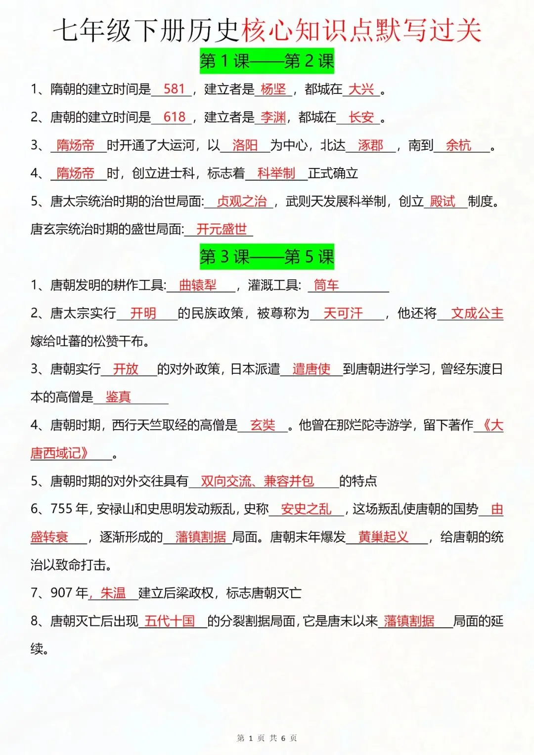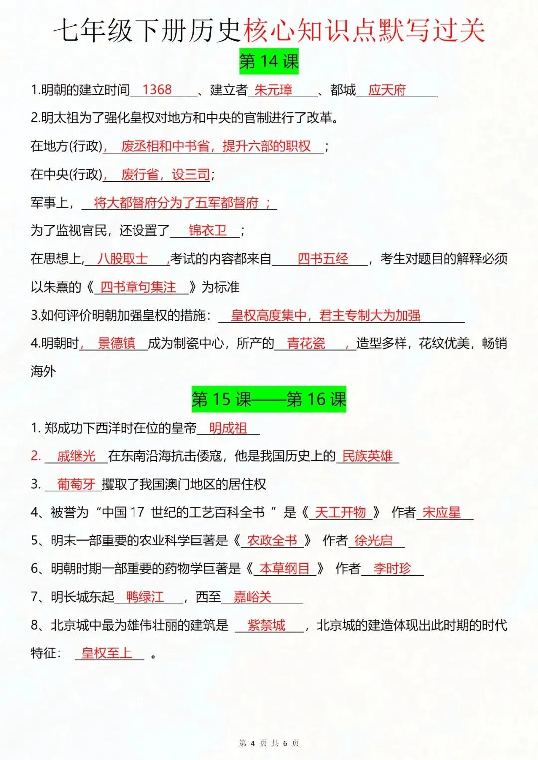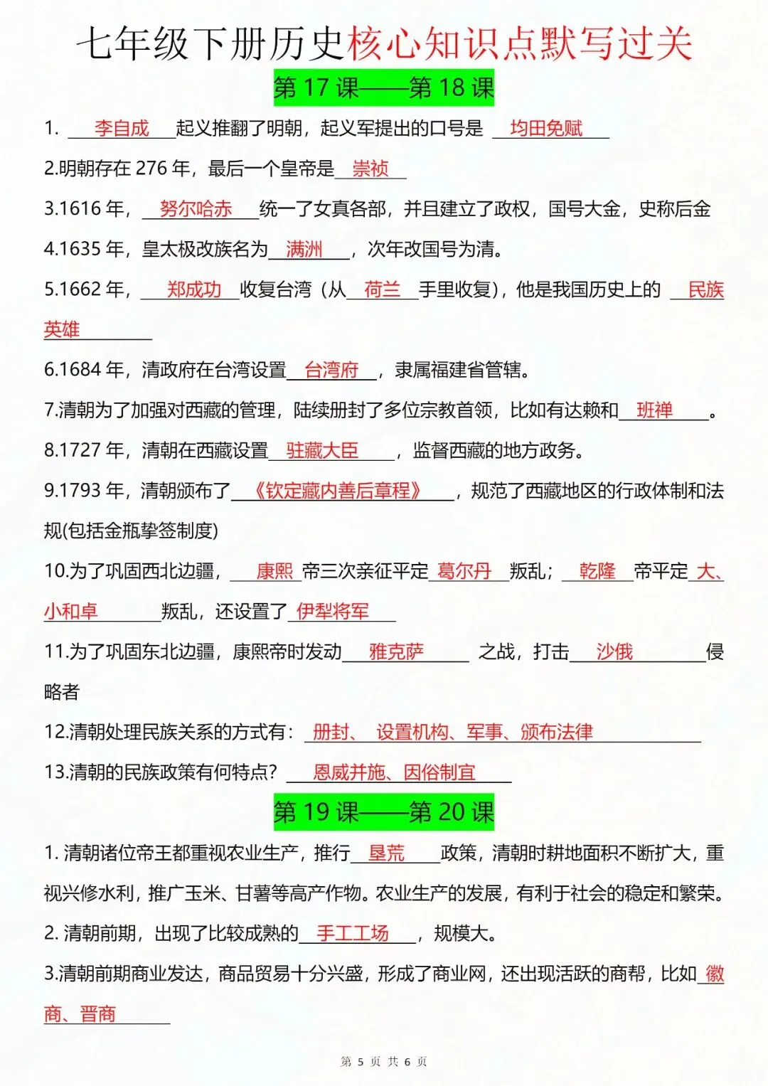 今天老师给大家整理了:七年级下册历史核心知识点默写过关电子版可打印!
