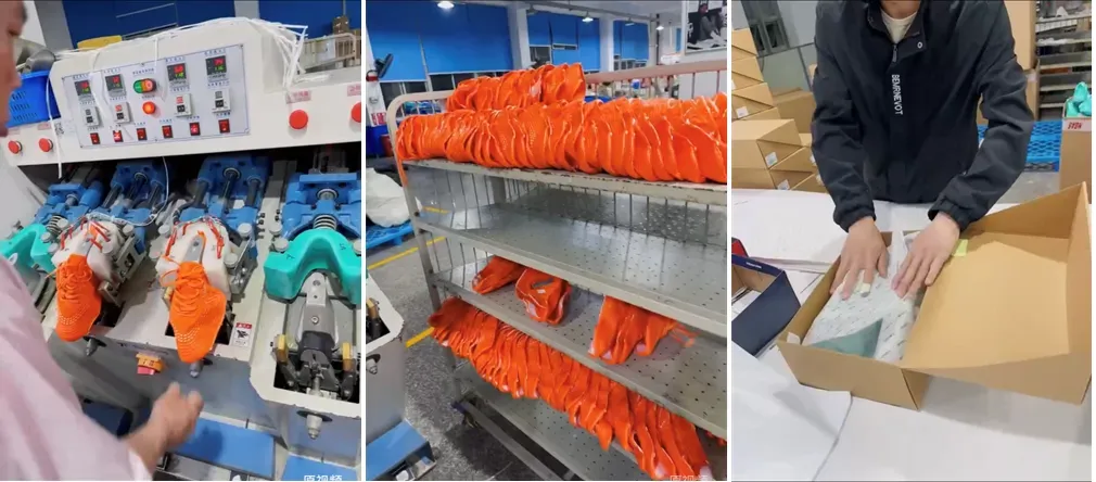 标准化制帮车间,炼胶、打浆、大底出型于一体的全套先进设备,4条国际先进的制鞋成型流水线,每一环都做到了精益求精。
