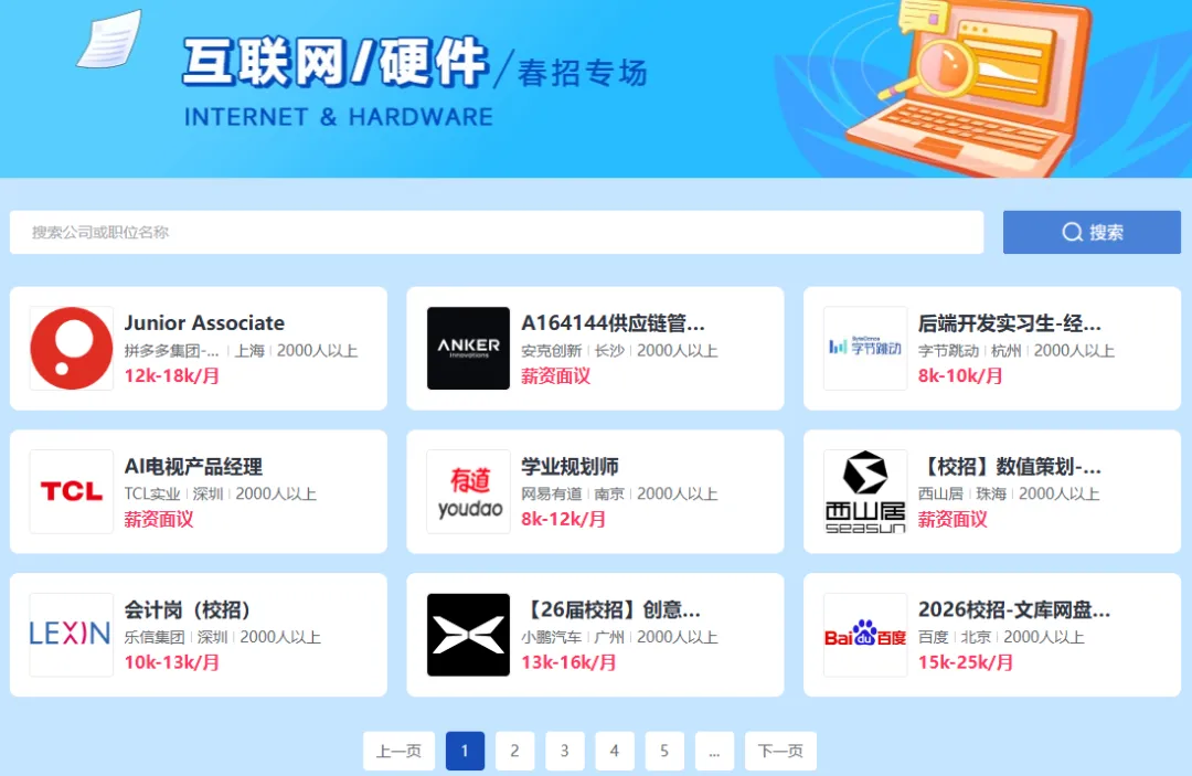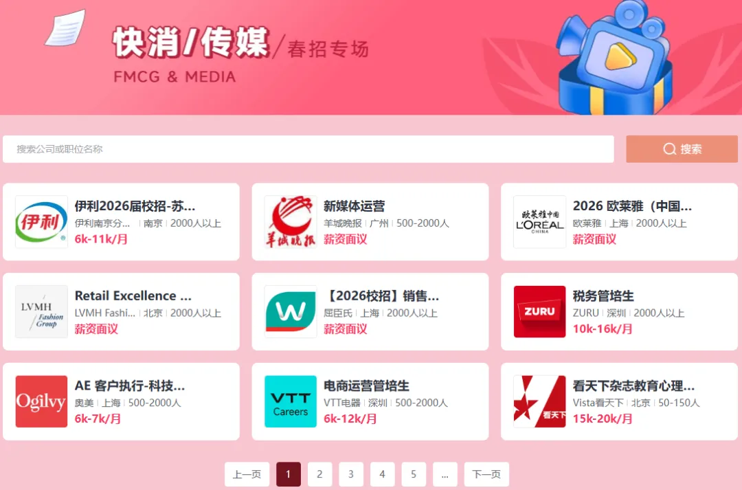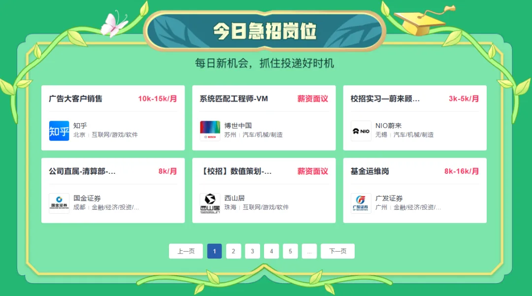 每日上新名企岗位,涵盖市场、教育、电子通信等多个行业,抓住投递好时机,春招offer直接手拿把掐~