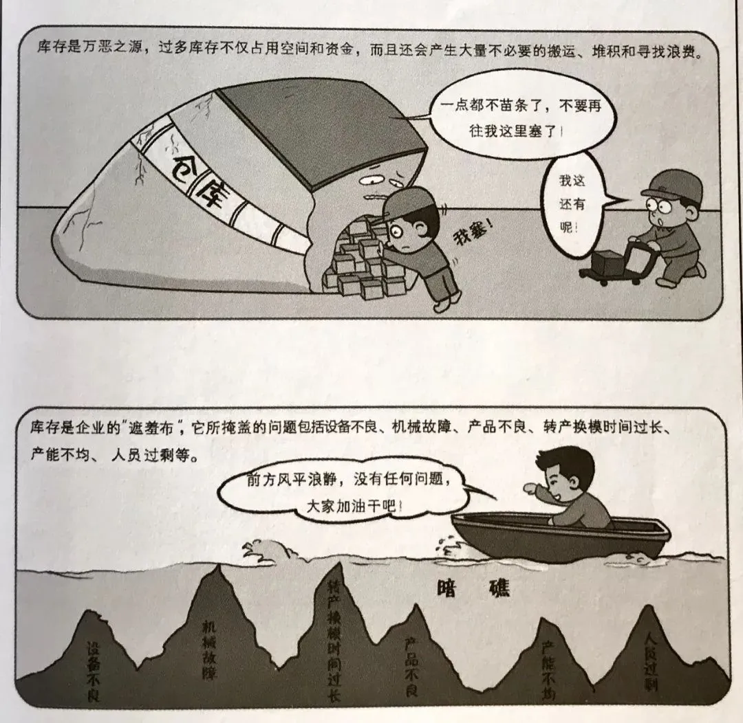 “库存是万恶之源”,过多的库存不仅占用空间和资金,产生大量不必要的搬运、堆积和寻找,而且还掩盖了企业内部的各种问题。例如,生产周期不合理、设备故障太多、不良品太多等。如果有了充足的库存,出现问题时可以有库存先顶上,问题就可以慢慢解决甚至不用解决,最起码不必现在急需解决。久而久之,就埋下了隐患的种子。