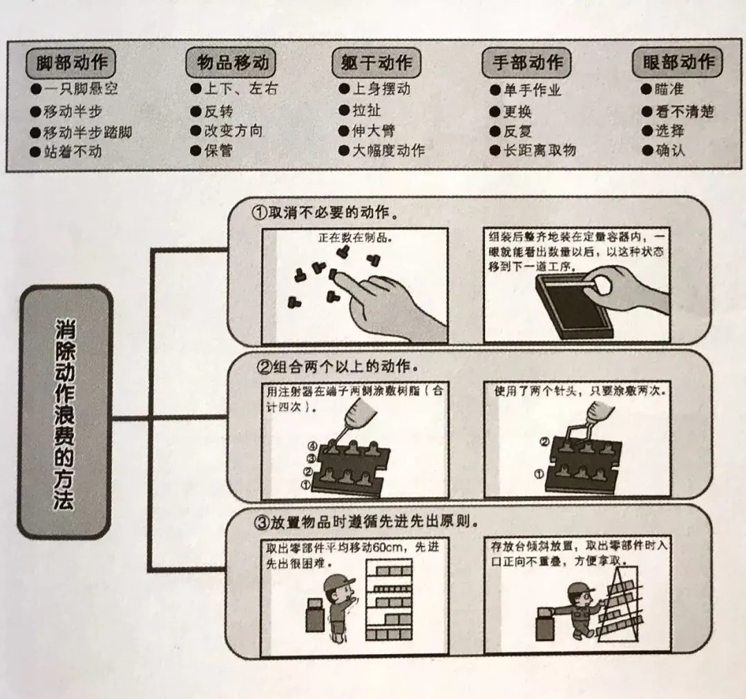 在生产过程中,人和设备的动作中只要不产生附加价值,都可称为动作浪费。例如,单手空闲、作业动作突然停止、作业动作过大、左右手交换、步行过多、转身的角度太大、移动中变换“状态”、伸背弯腰动作以及重复动作等,这些不合理的动作造成了时间和体力上的不必要消耗,都是动作浪费。消除动作浪费的三个主要改善方向为: