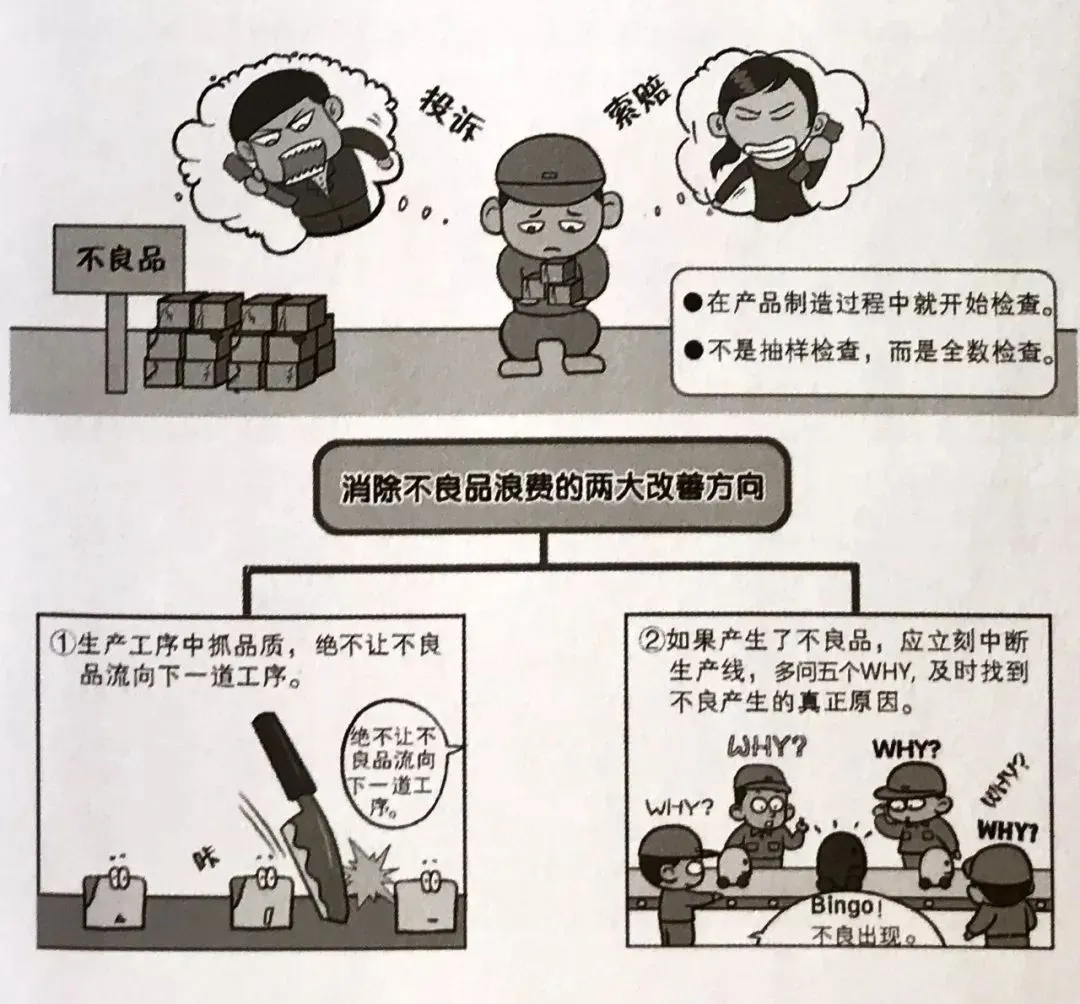 不良品浪费是指持续生产出不合格产品, 在产品检验、报废或返修活动中所造成的材料、机器和人工等浪费。如果不良品流向市场, 则会弓|起顾客的投诉和产品召回等更大的损失。消除不良品浪费的两大改善方向为:①生产工序中抓品质,绝不让不良品流向下一道工序,目标是做一批产品就合格一批“品,追求质量的零缺陷;②如果产生不良品,应立刻中断生产线,多问五个WHY,及时找到不良广生的真正原因。做到不接收不良,不制造不良,不流出不良。