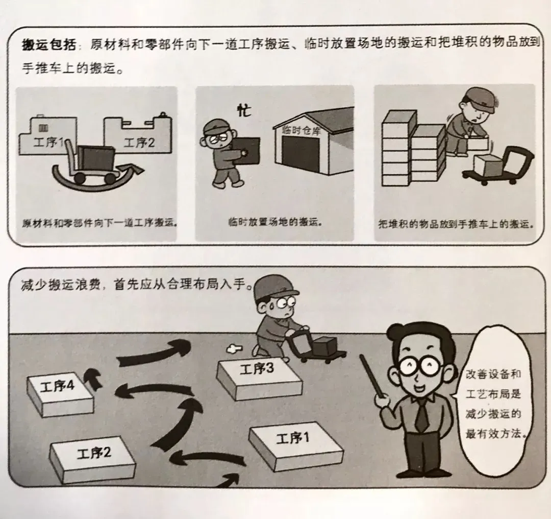 搬运动作遍及生产活动中的各个流程,包含放置、堆积、移动、整理等动作,但是搬运并不能产生附加价值,所以它本身就被认为是一种浪费。搬运包括原材料和零部件向下-道工序搬运、临时放置场地的搬运和把堆积的物品放到手推车上的搬运。其中,设备布局不合理、生产线布局不合理、工序流程不合理等是造成搬运浪费的主要因素。因此,要想消除搬运浪费,首先应从合理布局入手,尽可能减少搬运。