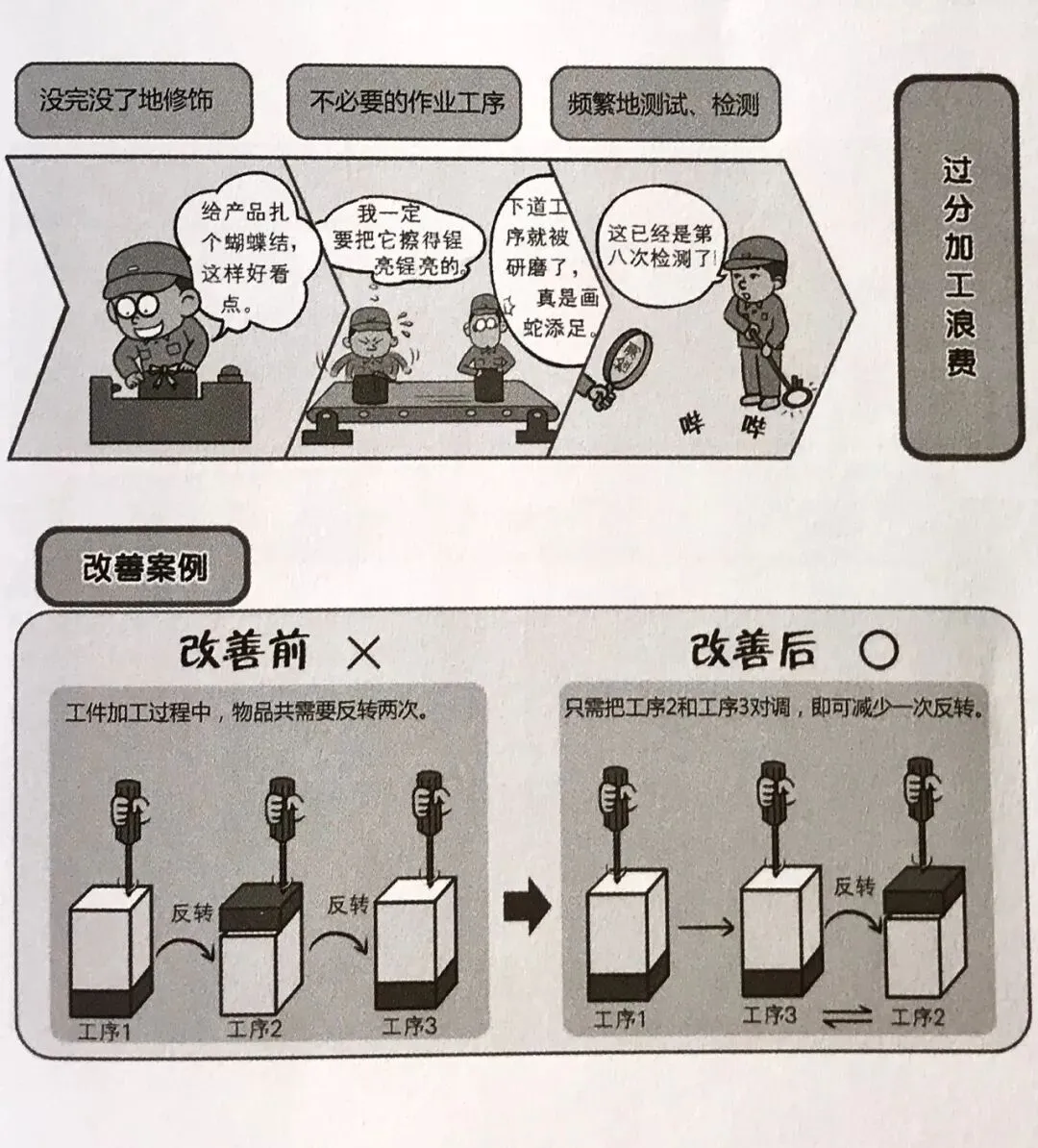 过分加工浪费是指加工质量或精度超过了下道工序需求或客户需求而造成的过度加工的浪费。例如,没完没了地修饰,频繁地测试、分类、检测。这些白白浪费了过多的工时、原材料和设备损耗等。在降低过度加工浪费的过程中可以对一些工序可以省略、合并或简化等。