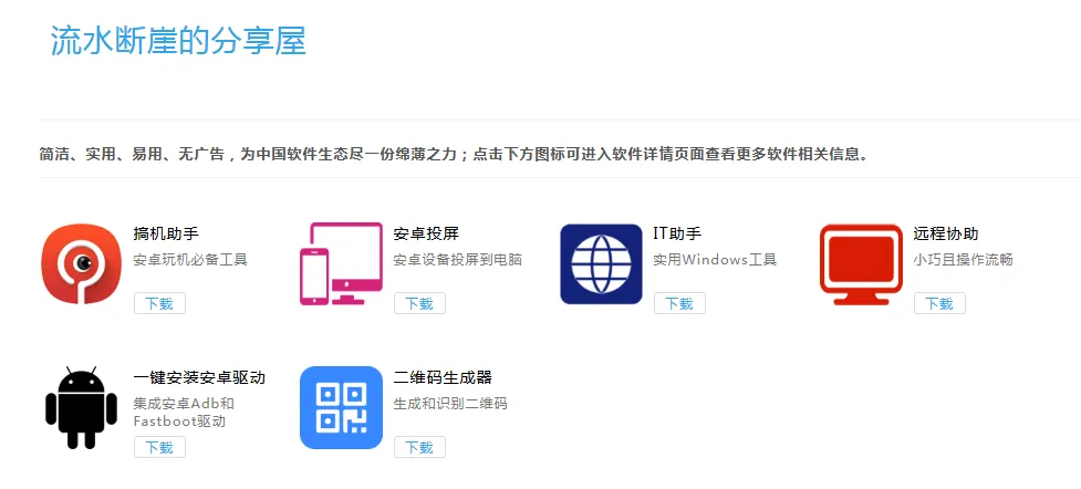 本打算放弃了,期间“流水断崖”这个词语浮现脑海。最早折腾手机驱动时,用得就是流水断崖的分享屋官网【1】上的“一键安装安卓驱动”,还有更多有趣工具。
