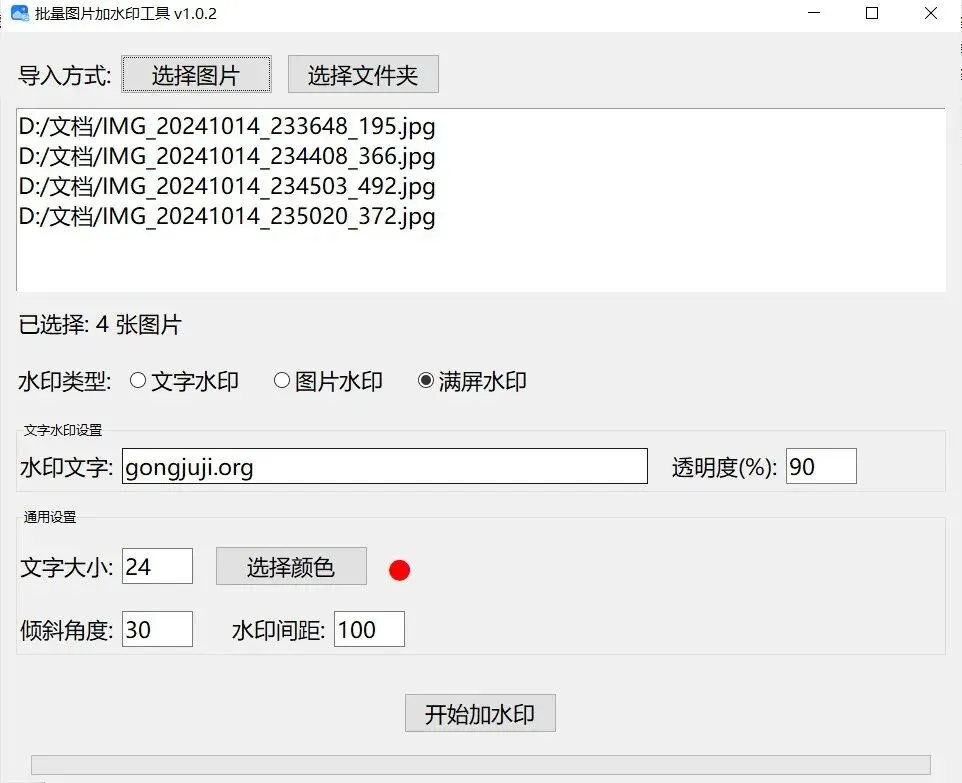 批量处理:确认效果后点击“开始加水印”,软件瞬间完成批量添加,水印覆盖均匀、观感自然。