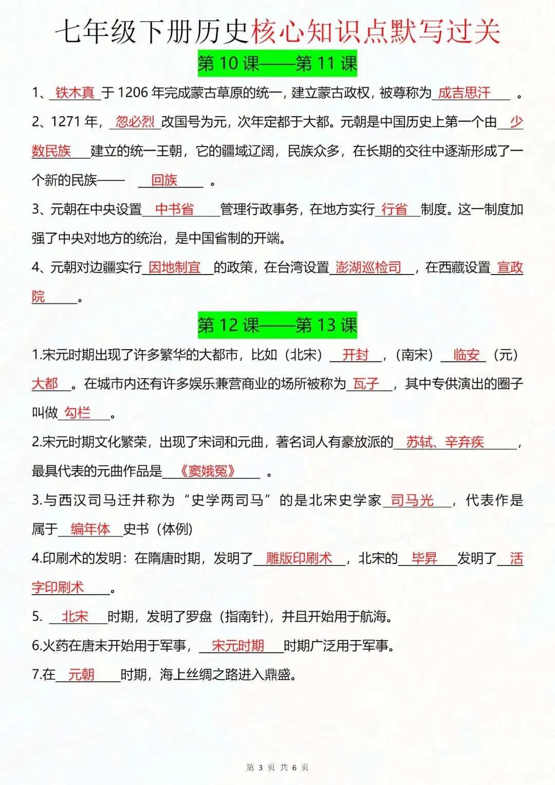 今天老师给大家整理了:七年级下册历史核心知识点默写过关电子版可打印!