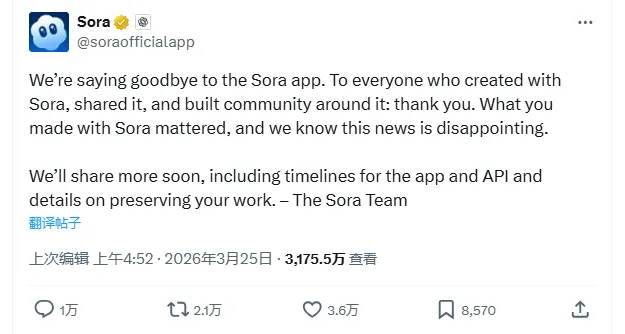 今天,OpenAI宣布关闭Sora App,这个曾经爆火的视频生成App落幕了。Sora在社交平台X发帖:我们正在向 Sora app说再见。感谢所有使用 Sora 创作、分享并围绕它建立社区的人:谢谢你们。你们用 Sora 创作的内容非常重要,我们知道这个消息令人失望。我们很快会分享更多信息,包括app和 API 的时间表以及如何保留你们作品的详细信息。– Sora 团队OpenAI于2025年10月1日发布Sora 2模型,并同步发布Sora App。当时,Sora被认为是AI版抖音。Sora App发布初期用户爆发式增长,但随后留存率下跌。视频生成模型需要大量的算力,视频生成类产品在无法盈利的情况下很难持续生存下去,这或许是OpenAI关闭Sora的原因之一。此外,大模型竞争激烈,Anthropic和Google以及中国开源大模型都给OpenAI造成了压力,OpenAI需要将资源聚焦在核心赛道上,以避免被超越。<- 完 ->