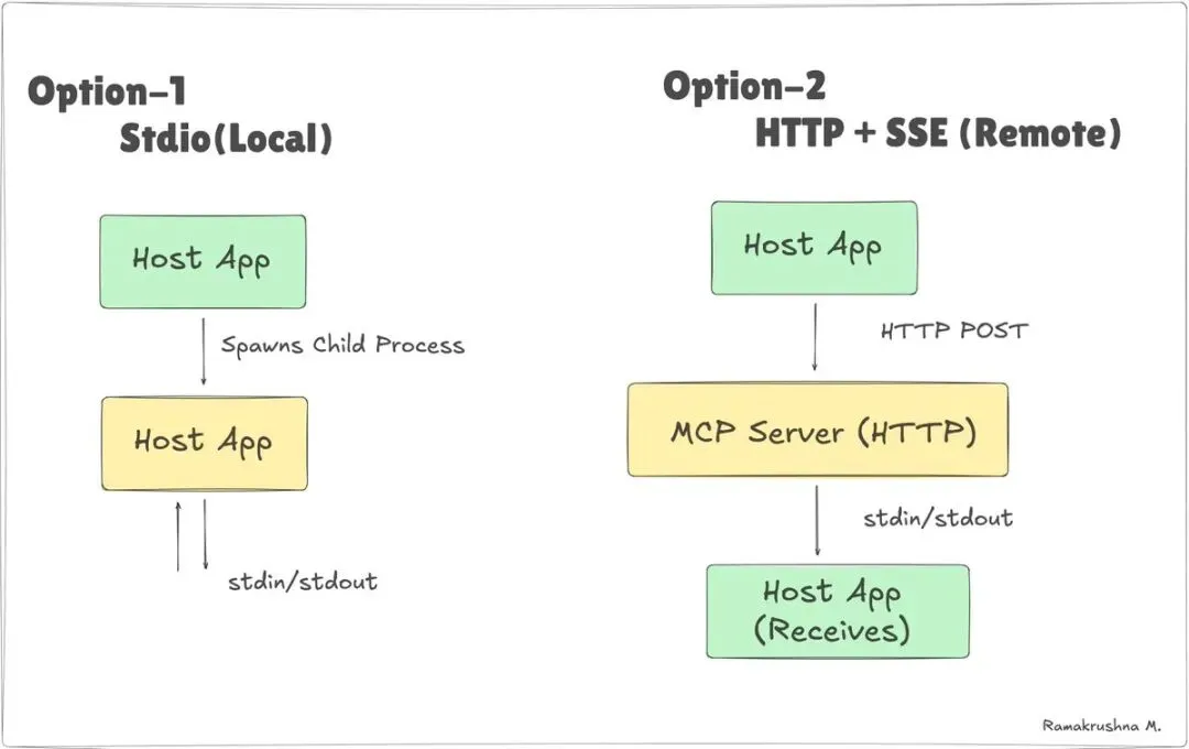 MCP 将协议与 transport 分离。相同的 JSON-RPC 消息可以根据你的部署通过不同的通道流动。有两个主要选项: