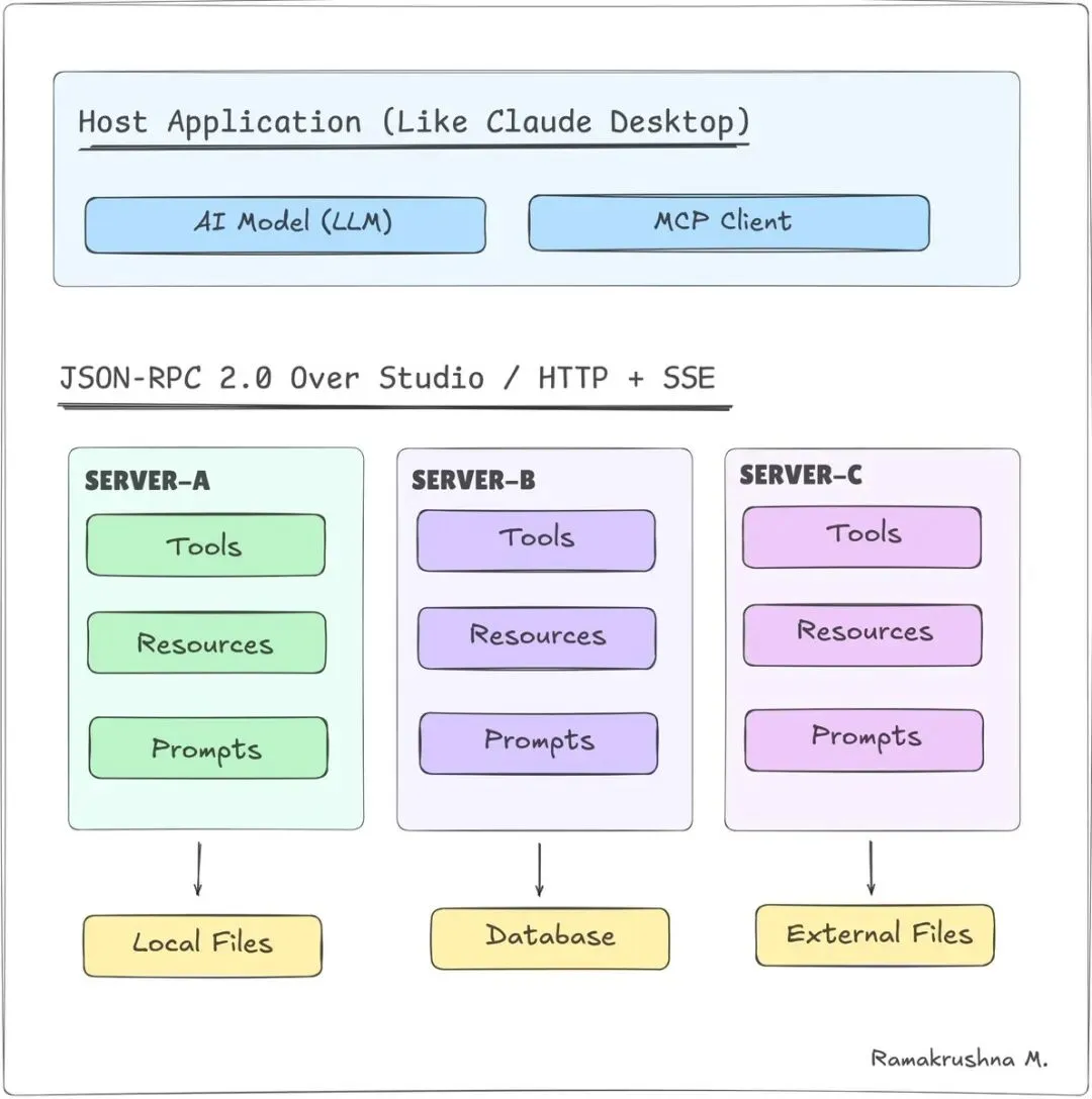 - MCP Server:你编写和部署的轻量级进程。它通过标准的 JSON-RPC 接口暴露能力(tools、resources、prompts)。