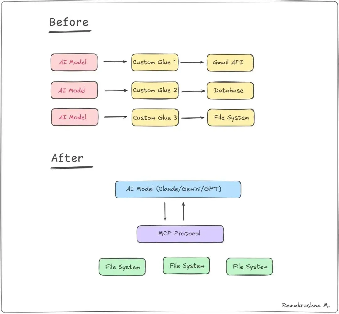 在 MCP 之前,每个 AI 集成都是定制的。调用天气 API 的工具与查询数据库的工具完全不同。开发者必须手工编写粘合代码,models 必须针对每个集成进行特别训练或提示。这是一片混乱。