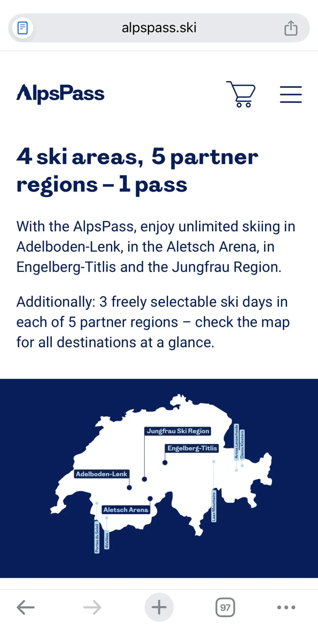四个大雪场无限滑:铁力士Engelberg-Titlis、少女峰Jungfrau、Aletsch Arena和Adelboden-Lenk,除此之外还有五个合作雪场(Arosa Lenzerheide、拉克斯LAAX、达沃斯Davos Klosters、太阳门Portes du Soleil、四山谷4 Vallées),雪季内每个雪场最多可以滑三天。