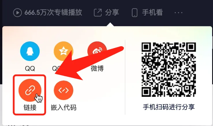 2、在【分享】面板中,点击【嵌入其他站点】,复制【链接】即可成功复制链接地址到剪切板
