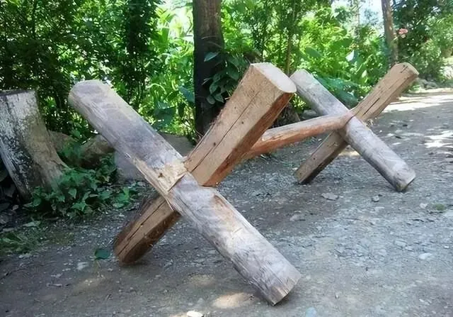 第一个 , 锯马 , 你们老家叫啥?就是架木头用的 , 把山上砍回来的大料往上面一放 , 斧子锯子轮番上 , 先粗加工成小块木料。