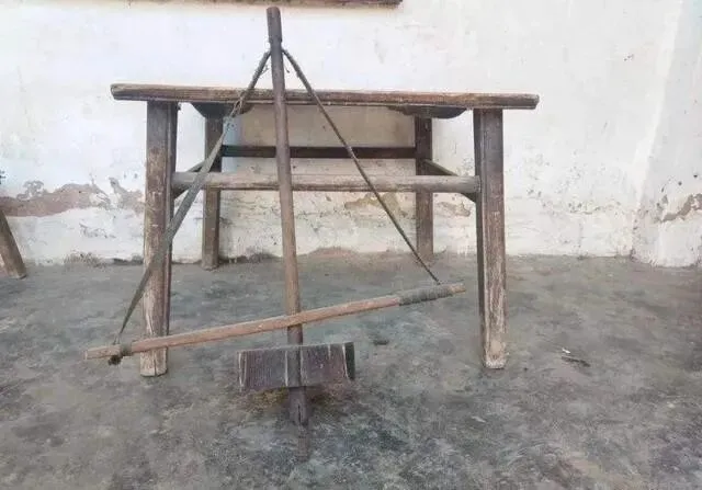 牵钻 , 一手握主柱一手拉横杆 , 全靠手劲儿和巧劲儿 , 比现在的电钻慢太多了 , 但那个年代就是靠这个打眼儿的。