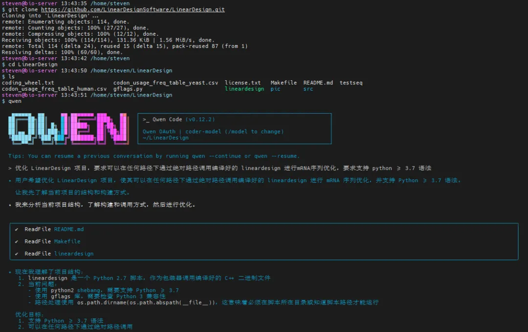 虽然 Gemini CLI 能力更强(如联网搜索、长上下文),但 Qwen Code 在本地文件操作、代码生成方面更成熟,而且主打国产自主、每天 2000 次免费额度,适合中文社区和阿里生态。因此,我们在这里选择使用 Qwen Code CLI 对 LinearDesign 上面提到的两个尝试进行 AI 优化修复。