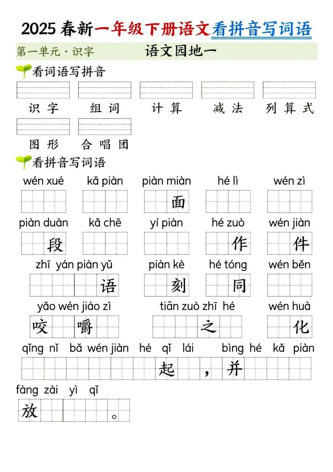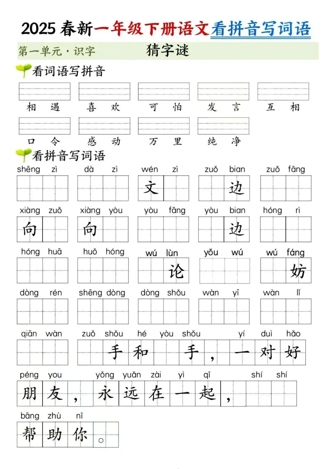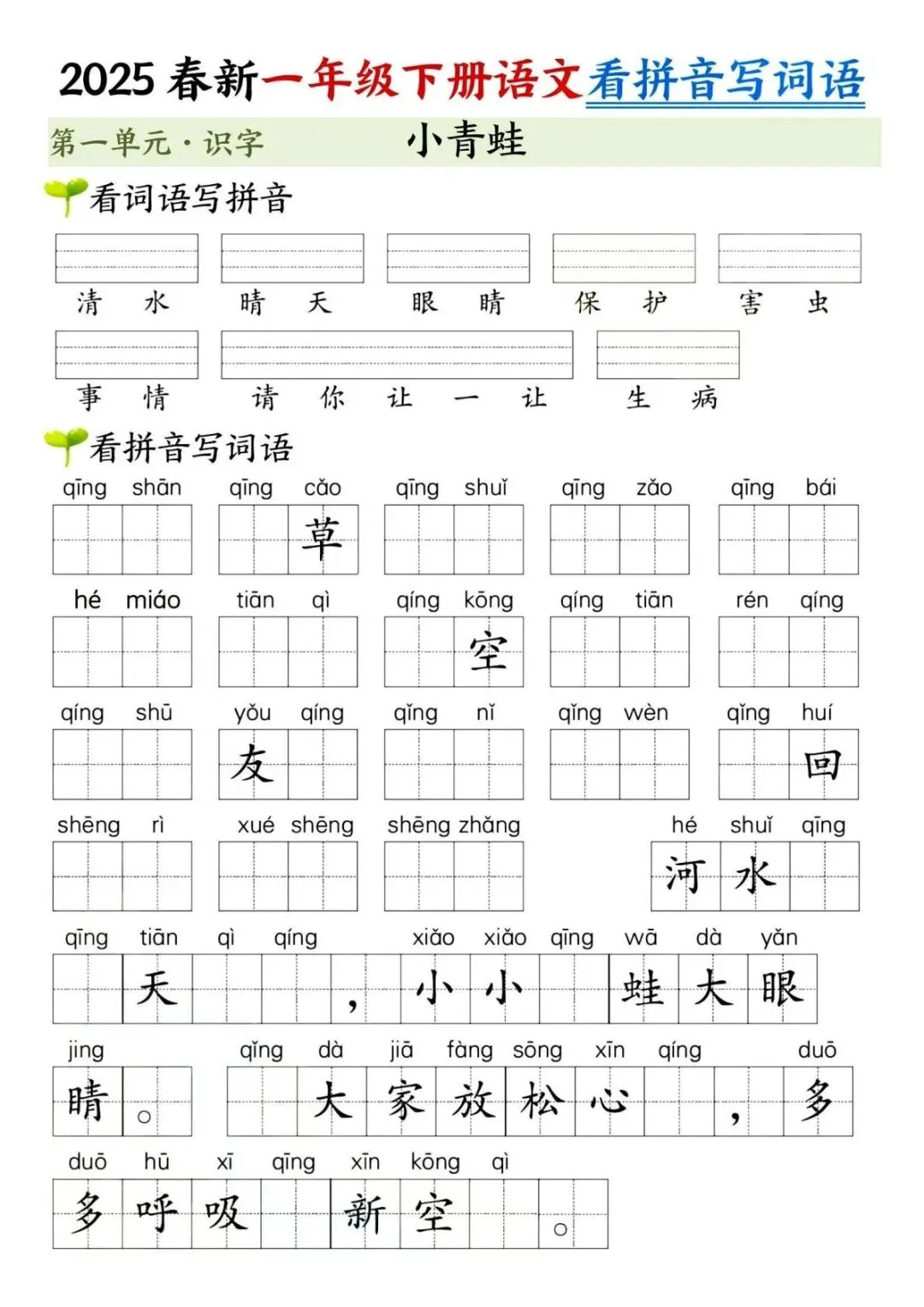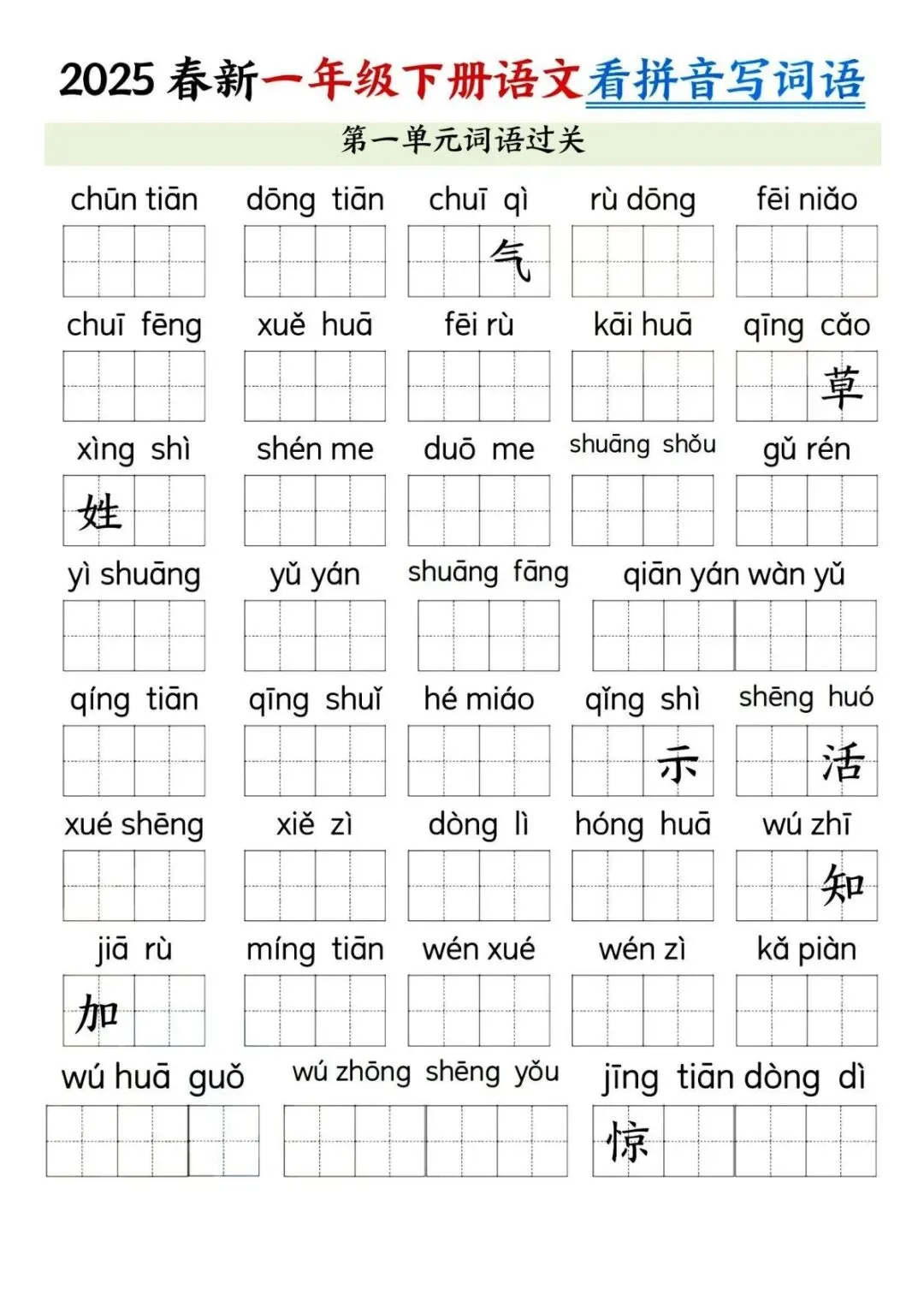 一年级下册语文看拼音写词语默写单来啦!贴合课本第一单元识字内容,涵盖春夏秋冬、姓氏歌等篇目,拼音填词 + 词语写拼音双向练习,还有答案和过关检测,夯实字词基础超实用,孩子随堂练、课后测都适配,语文启蒙必备~