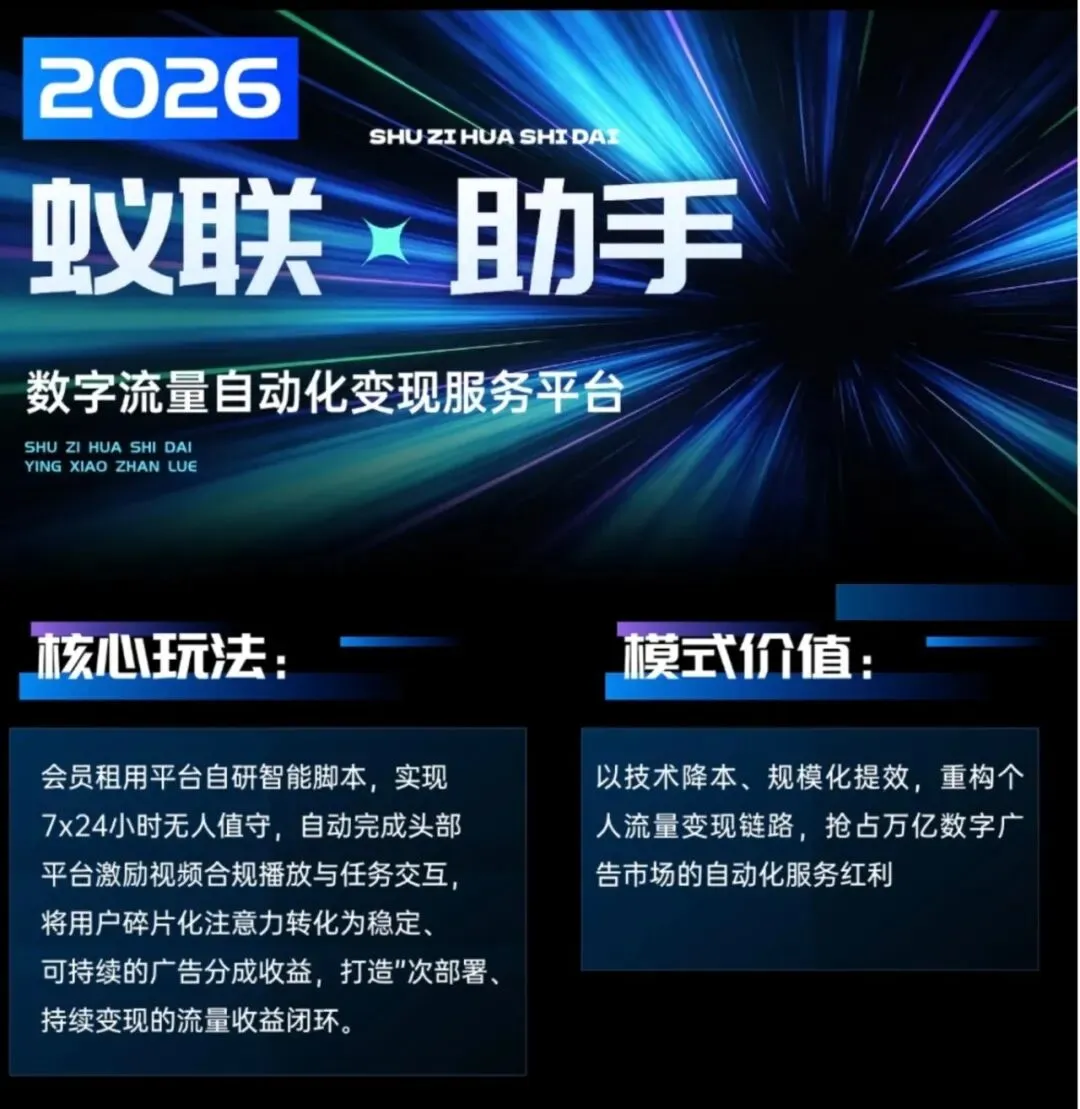 蚁联助手以技术为核心,以合规为基础,为用户打造一站式数字流量自动化变现解决方案,7×24小时无人值守,脚本自动完成头部平台激励视频合规播放与任务交互,无需人工操作,真正实现“躺赚”被动收益。