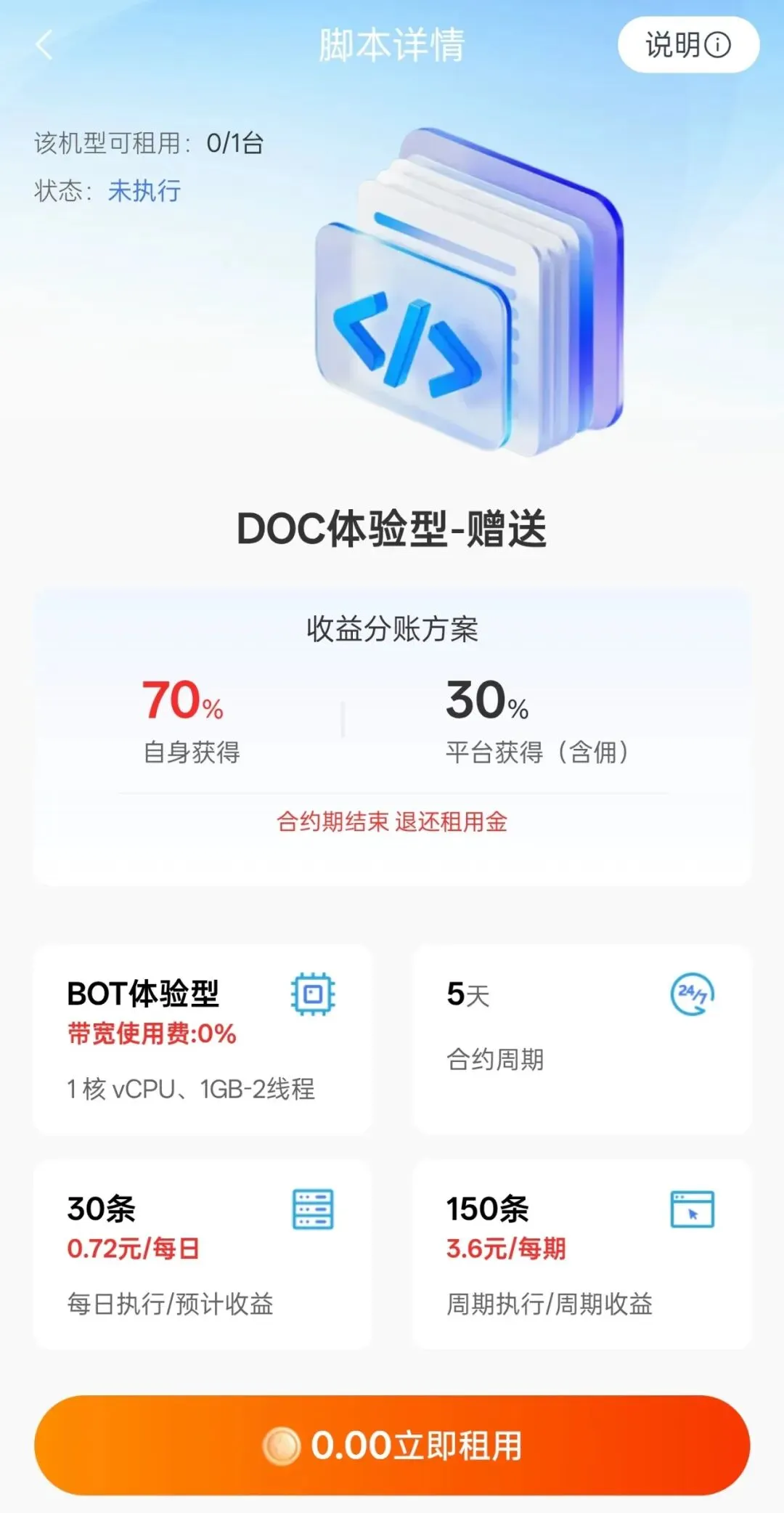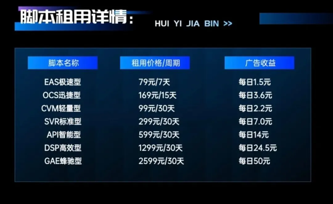 简单理解就是租用脚本之后,每天可获得对应广告收益,到达周期后返还租赁脚本的费用,只收取10%作为公司宽带的使用费用。——“科技不再高高在上,而是服务于人。”