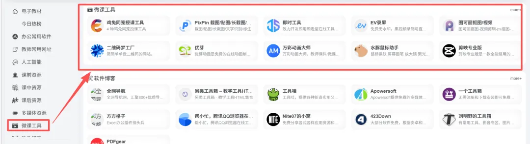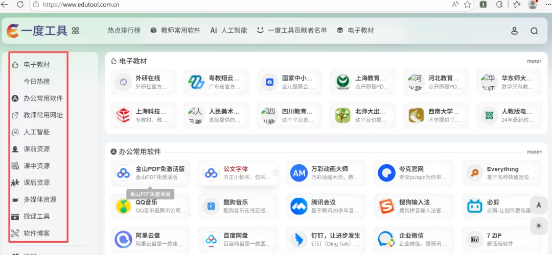 1、打开一度工具官网:https://www.edutool.com.cn,在左侧工具栏会看到电子教参、办公常用软件、 教师常用网址、人工智能软件、课前资源、课中资源、课后资源、多媒体资源、微课工具、软件博客工具分类。