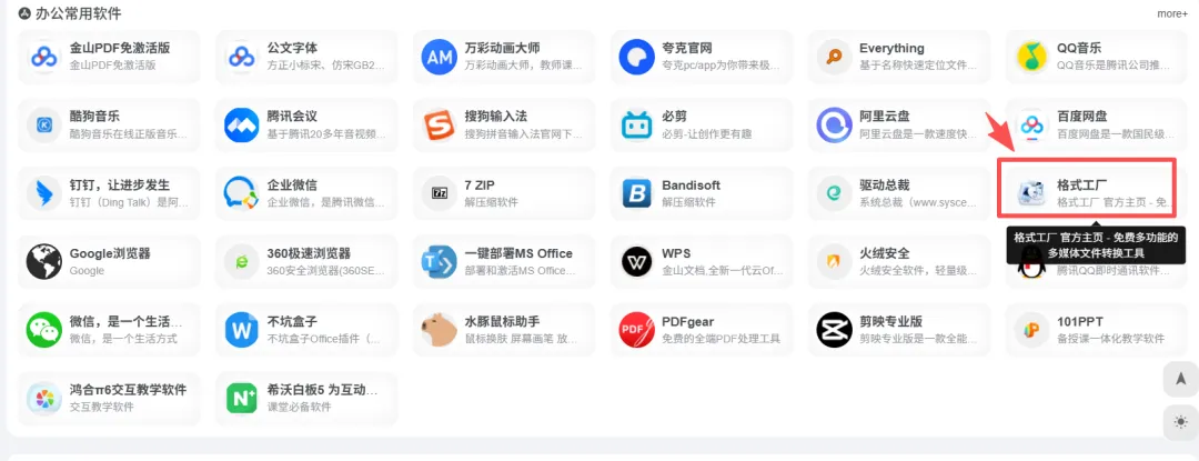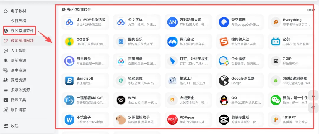 3、点开左侧办公常用软件工具,我们会发现里面涵盖101PPT、格式工厂、希沃白板5等32种常用办公软件官方下载直通链接。