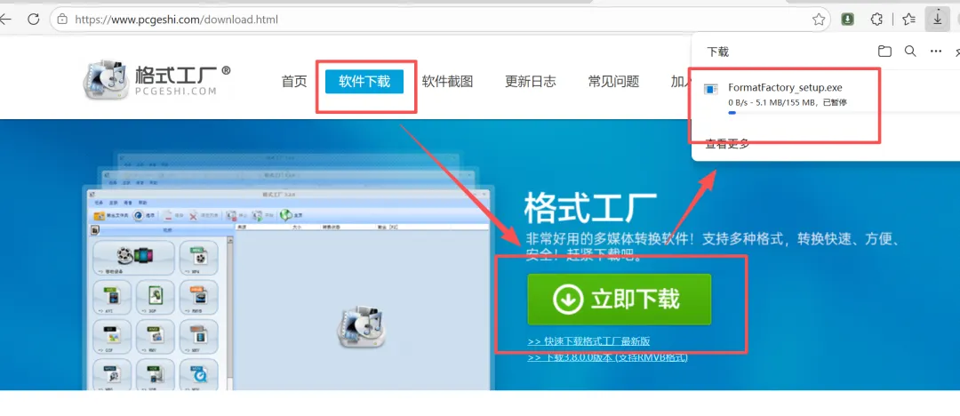 第四步直接跳转到格式工厂官方网站,点击软件下载、立即下载即可。
