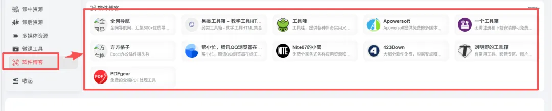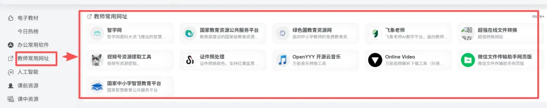 3、点开左侧教师常用网址工具,我们会发现里面涵盖国家教育资源公共服务平台、国家中小学智慧教育平台、飞象老师、智学网等12种常用教学网站。