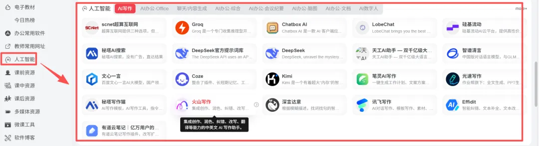 4、点开左侧人工智能工具,我们会发现里面扣子、DeepSeek、秘塔、Kimi等21款AI官方网站。