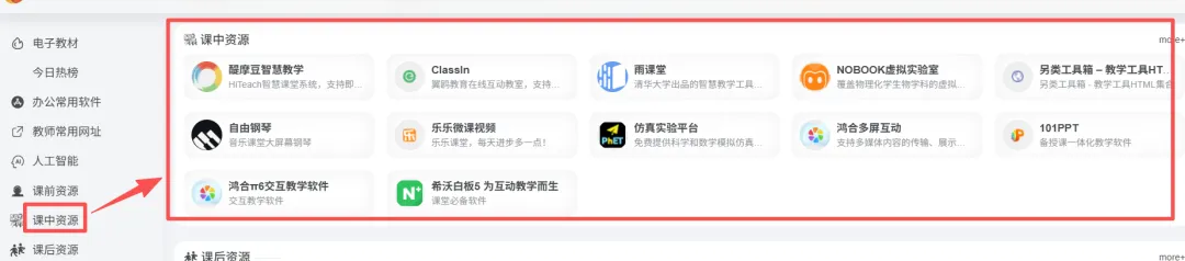 6、点开左侧课中资源工具,我们会发现里面涵盖NOBOOK虚拟实验室、鸿合多屏互动、仿真实验平台等12种课中可以使用的资源官网。