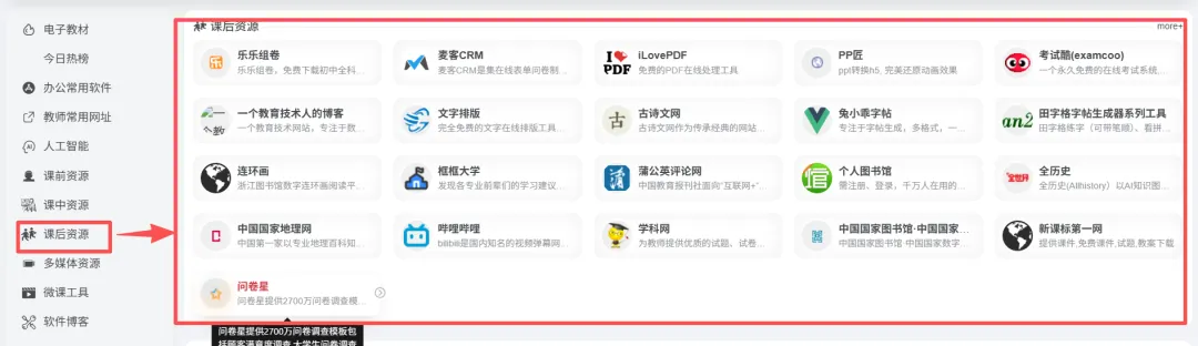 7、点开左侧课后资源工具,我们会发现里面涵盖乐乐组卷、乐乐组卷、问卷星、考试酷(examcoo)等21种课后可以使用的资源官网。