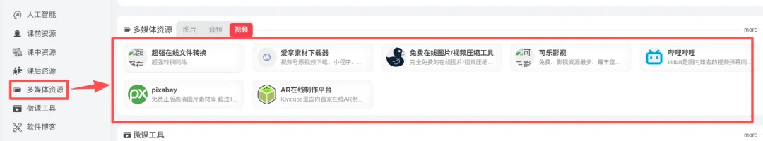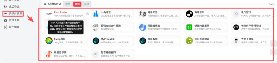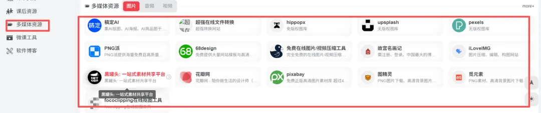 8、点开左侧多媒体资源工具,我们会发现里面涵盖图片、音频、视频三部分资源。第一部分图片资源,里面涵盖花瓣网、图精灵、觅元素等16个图片资源官网直通链接。