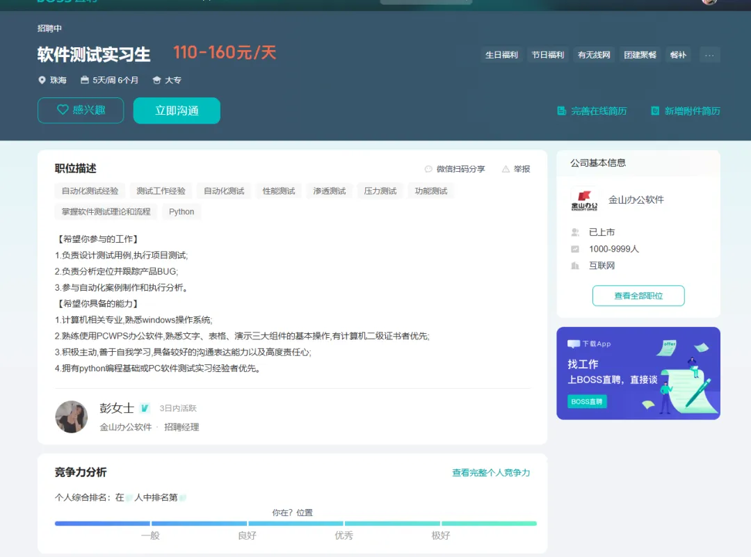 北京实习|金山办公软件招软件测试|110–160元/天