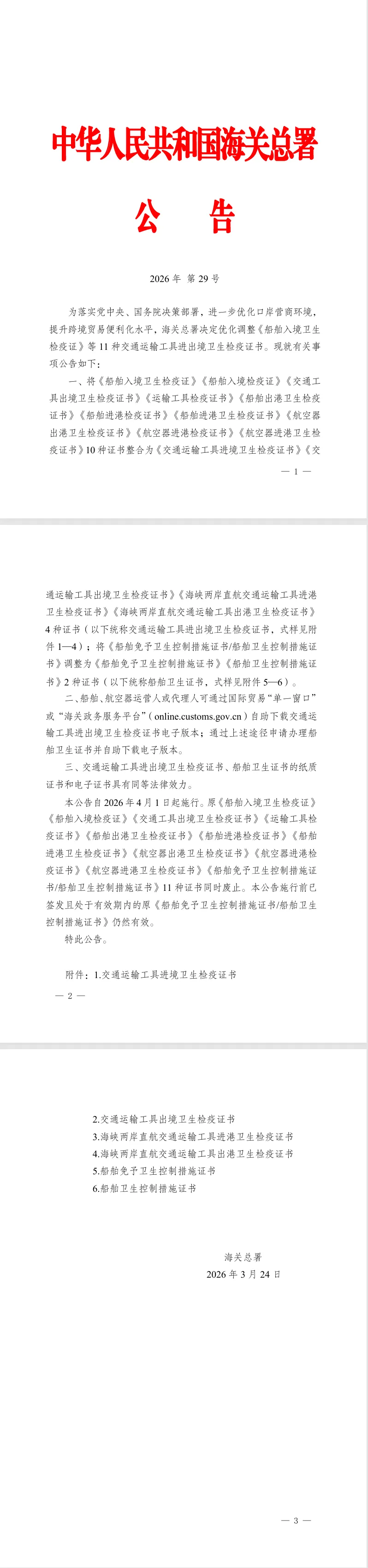 为落实党中央、国务院决策部署,进一步优化口岸营商环境,提升跨境贸易便利化水平,海关总署近期发布《海关总署关于调整交通运输工具进出境卫生检疫证书有关事项的公告》(以下简称《公告》),对交通运输工具进出境卫生检疫证书进行优化整合,同步推广电子证书,相关措施自2026年4月1日起正式施行。